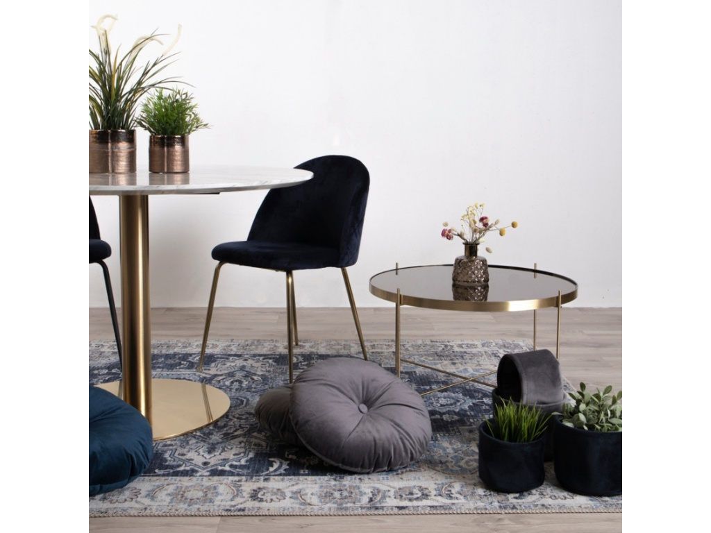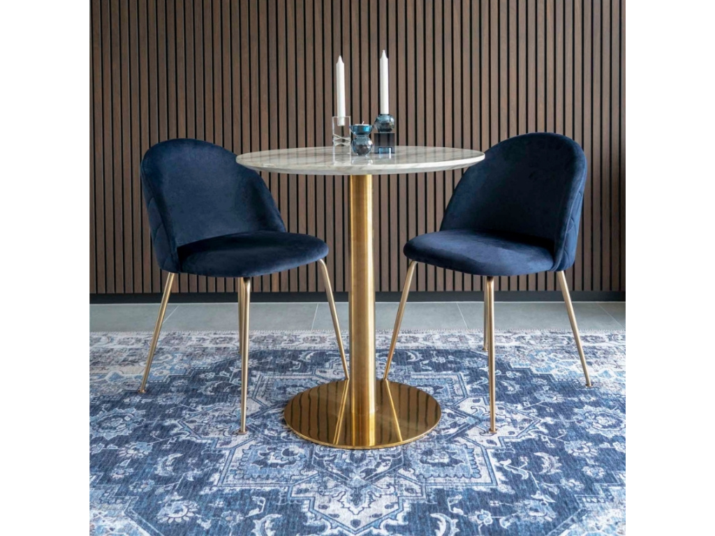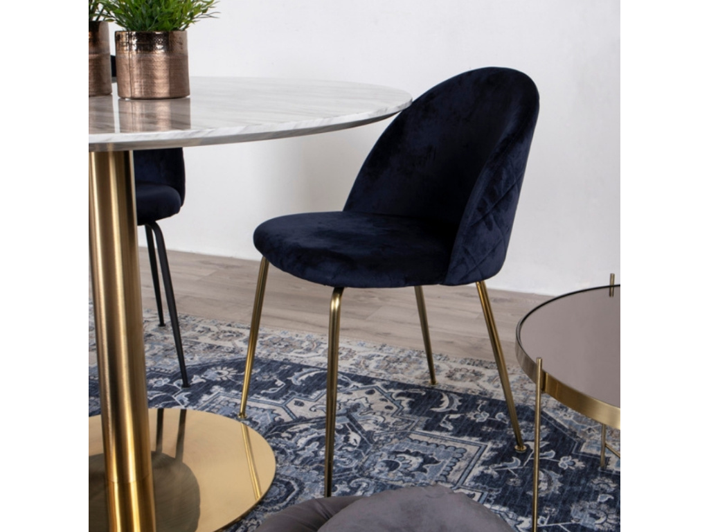 Anneke je elegantní jídelní židle, která zaujme na první pohled díky atraktivnímu designu a působivé kombinaci barev. Sedák židle je čalouněný modrou sametovou látkou příjemnou na dotek a zadní část opěrky zdobí jemný detail prošívání. Vneste do svého domova závan aktuálních trendů s židlí Anneke.