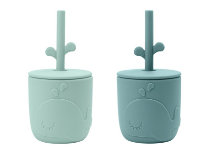 Silikonová sada misky a lžičky od Done by Deer zabaví u jídla i ty nejmenší jedlíky. Roztomilá velryba Wally plave kolem misky a vystřikuje kapky vody. Lžička je v jednoduchém designu velrybí ocasní ploutve. Zespodu na misce najdete praktickou přísavku, díky níž miska nesklouzne z žádného hladkého povrchu. Silikonový materiál zaručí nerozbitnost nádobí, a vysoký okraj misky usnadní dětem nabírání jídla. Mořské vlnky na okraji misky jsou ideálním místem pro odložení lžičky.