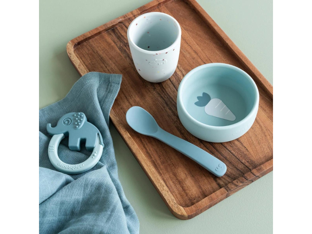 Silikonová jídelní sada od Done by Deer je skvělou volbou pro všechny malé jedlíky, kteří se učí jíst samostatně. Protiskluzová miska má vyvýšené okraje, které umožní snadné nabírání jídla. Hrneček a lžička jsou lehce uchopitelné do malé dětské ručičky. Celá sada je v krásném modrém provedení s drobnými konfety a jednoduchý design podtrhuje motiv roztomilé mrkvičky.