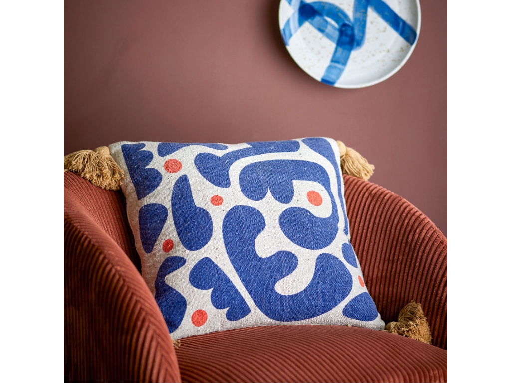 Polštář Eviaya od značky Bloomingville je oslavou radosti z detailu a šetrnosti k přírodě. Je vyrobený z recyklované bavlny, zdobený jemným potiskem v odstínech modré a hravými třásněmi v kontrastních barvách, přinese do každého interiéru špetku svěžesti, útulnosti a radosti z detailu. Skvěle se bude vyjímat na pohovce, křesle i posteli, kde dodá prostoru hravý a zároveň klidný akcent. Každý kus je originál – malý důkaz toho, že i z nevyužitého může vzniknout něco opravdu výjimečného. Eviaya spojuje styl, pohodlí a ohleduplnost v jednom. A přesně takový doplněk si váš domov zaslouží.
