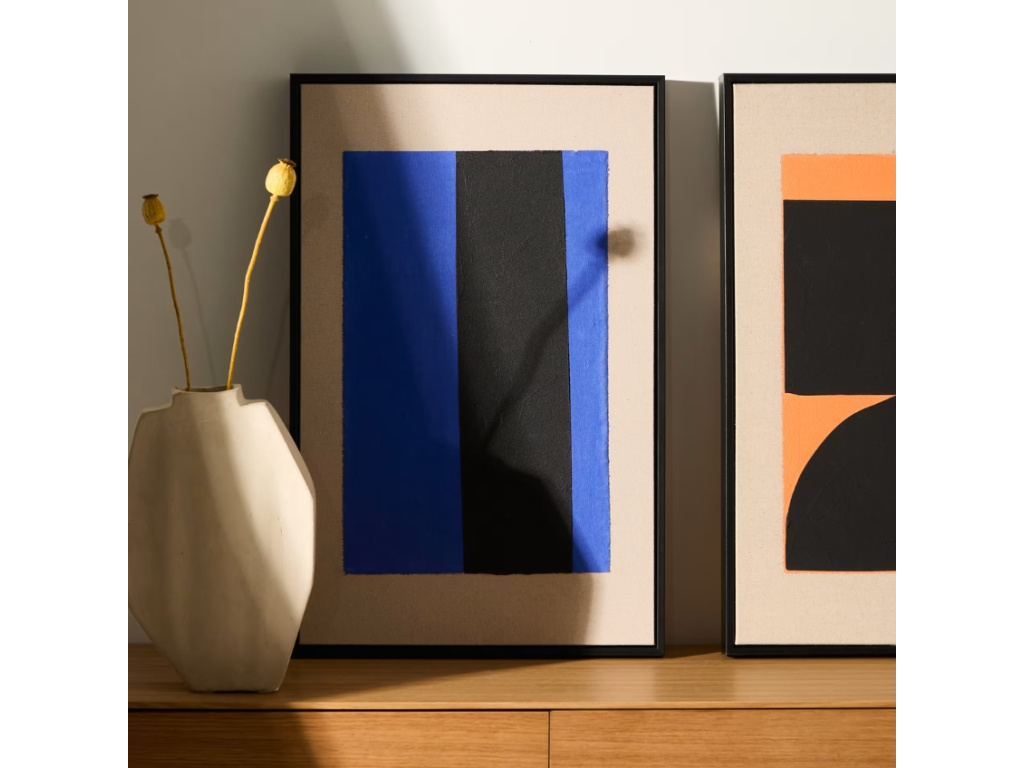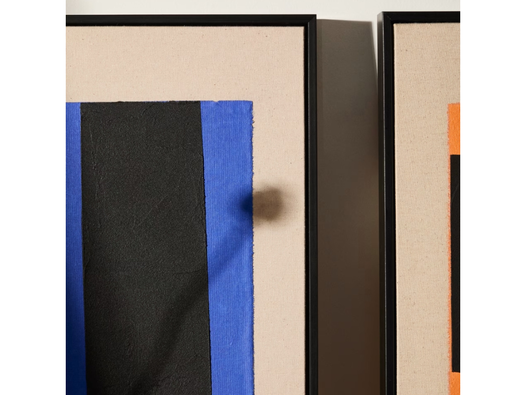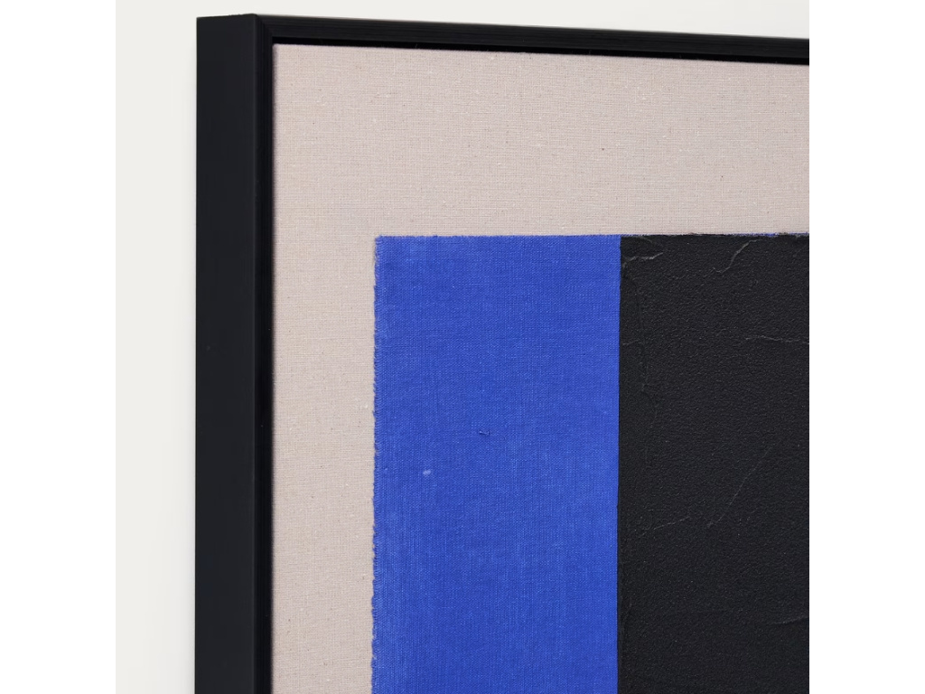 Abstraktní obraz Zernu zaujme hrou kontrastů – černá barva v kombinaci s modrou vytváří vizuálně silnou kompozici s efektem světla a stínu. Ruční malba je vytvořena na lněném plátně, jehož povrch je navíc chráněn lakem, což zajišťuje dlouhou životnost a odolnost proti prachu. Díky výrazné textuře, kde se střetává hrubost malby s jemností tkaniny, každý kus přirozeně vynikne jako solitér – nebo vytvoří působivý set spolu s dalšími obrazy z této kolekce. Rám v černé barvě dodává celé kompozici čistý výraz a díky praktickému háčku na zadní straně je zavěšení velice snadné.