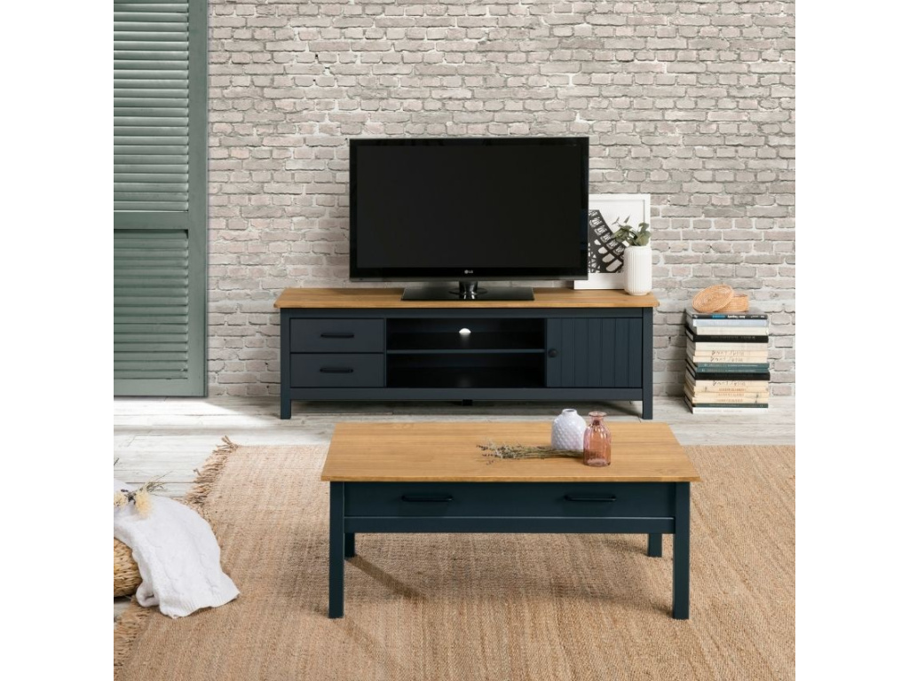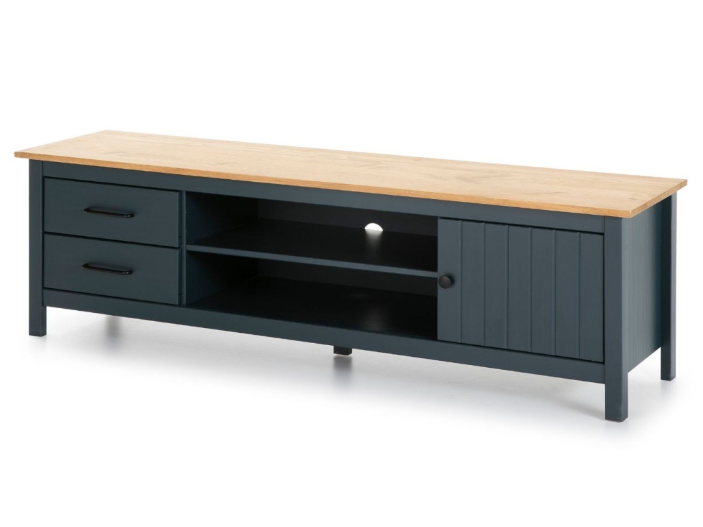 Televizní stolek Miranda od značky Marckeric v modro šedé barvě vyrobený z masivního borovicového dřeva se stane jedinečným a stylovým doplňkem vašeho obývacího pokoje. Obdélníkový matně lakovaný korpus z masivního dřeva nabízí prostorný úložný prostor díky 2 zásuvkám a několika policím. Atraktivní kontrast dodává deska stolku, která je zanechaná v přírodním borovicovém odstínu. Doporučujeme tento TV stolek kombinovat také s ostatními produkty řady Miranda, získáte díky tomu dokonalou souhru nábytku ve vašem interiéru.