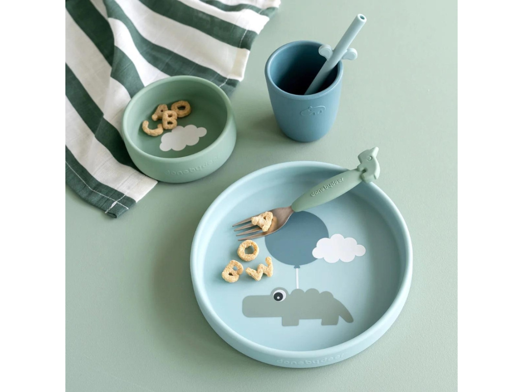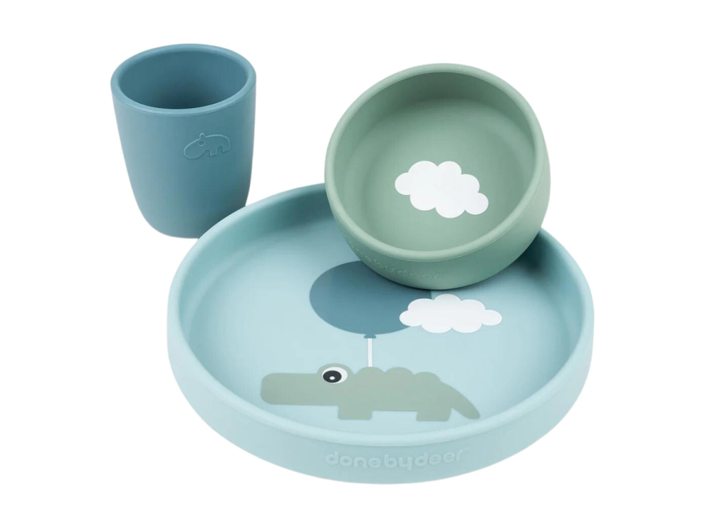 Tato jídelní sada pomůže všem malým jedlíkům samostatně jíst své pokrmy. Silikonový povrch zajistí, že nádobí nebude sklouzávat ze stolu. Kelímek je tvarovaný tak akorát do malé dětské ručičky, a zaoblené vnitřní hrany misky a talíře usnadní nabírání jídla. Sada je zdobena krokodýlem Crocem na balónku a bílými mráčky. Další produkty s veselými motivy zvířátek z kolekce Deer friends můžete najít pod značkou Done by Deer.