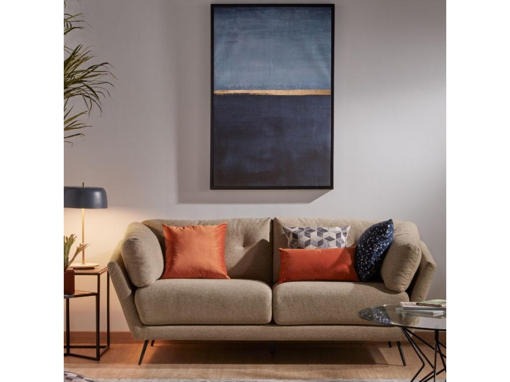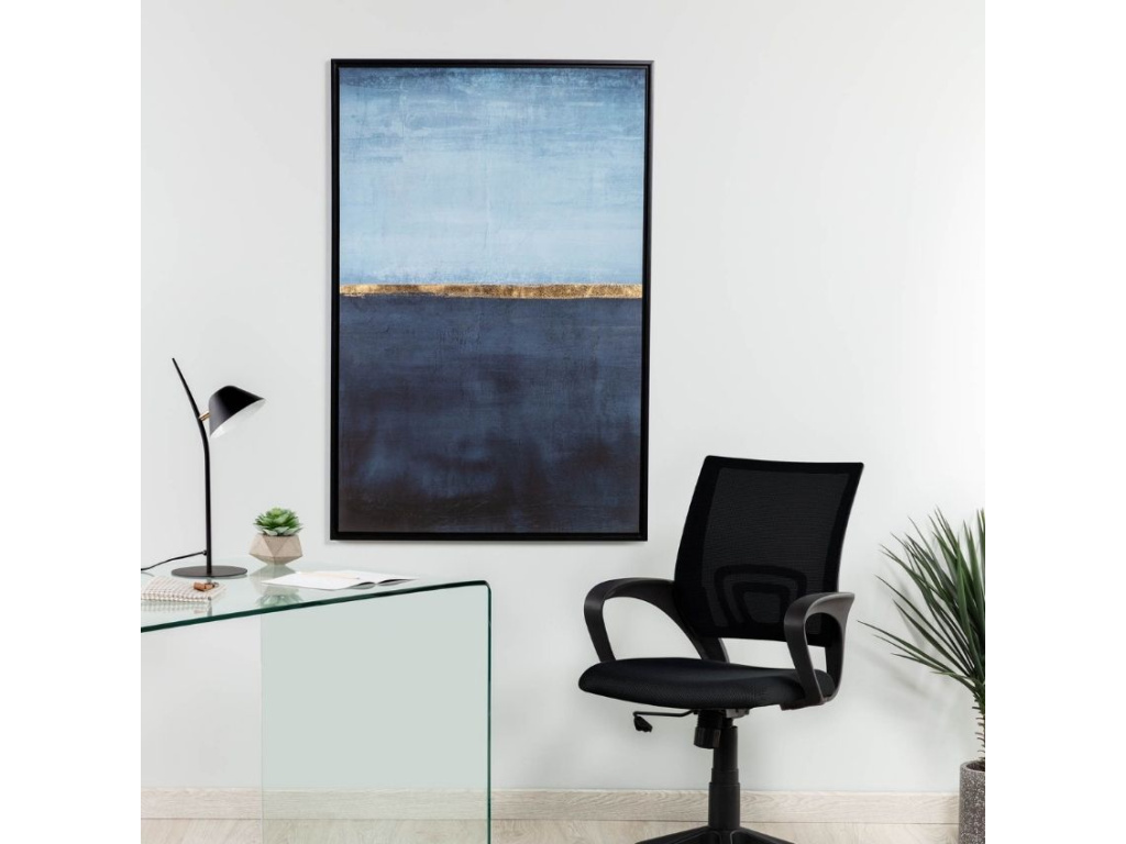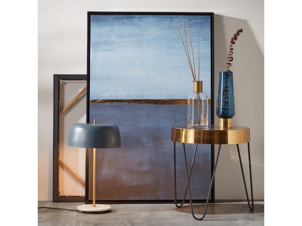 Modro zlatý abstraktní obraz Kave Home Wrigley vnese umělecký nádech do vašeho moderního interiéru. Na plátně se spojují minimalistické abstraktní tvary a kontrastní kombinace zlaté a modré barvy. Rám z MDF v černé barvě podtrhuje intenzitu celkového dojmu. Háčky zaručí snadné zavěšení.