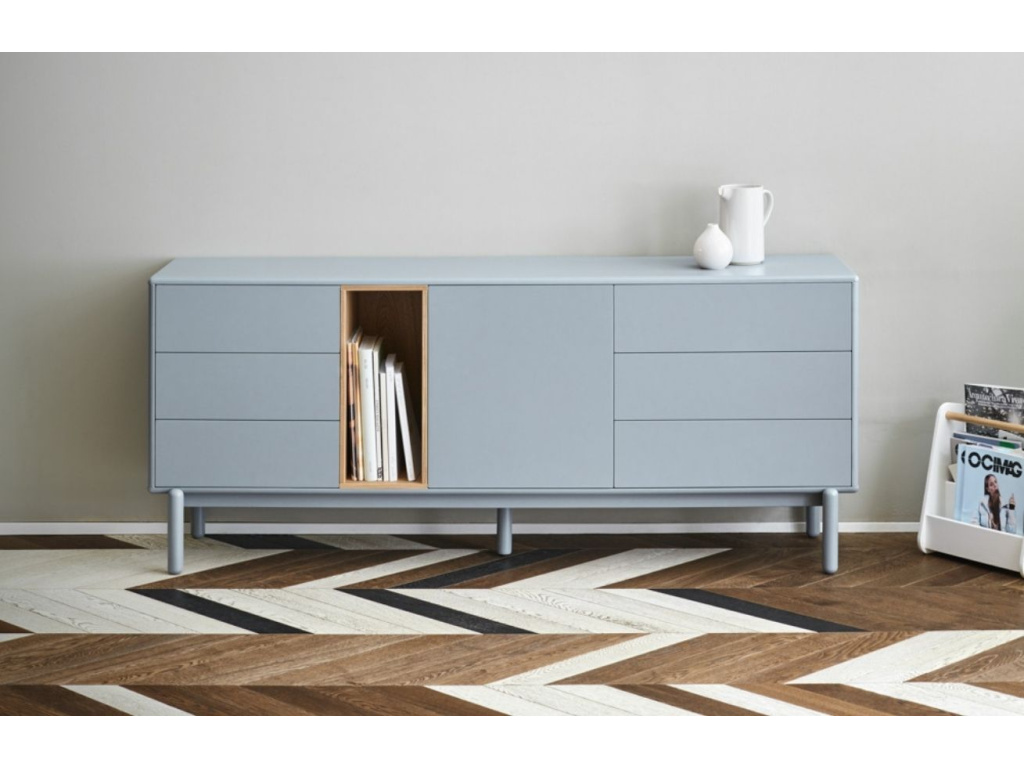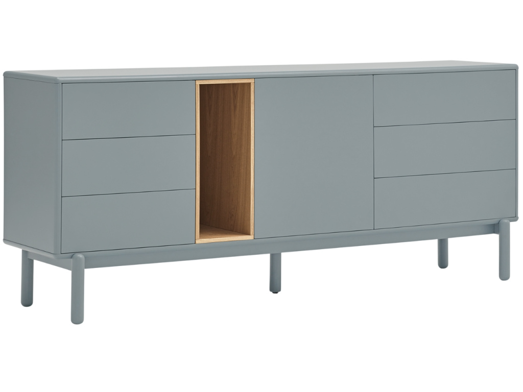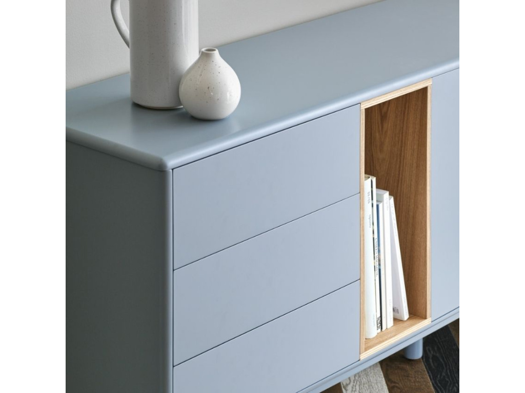 Komoda Teulat Corvo v zajímavé šedo modré barvě vás na první pohled zaujme svým minimalistickým designem a různorodě řešeným a velkým úložným prostorem. Korpus komody je z lakovaného MDF, které si oblíbíte pro snadnou údržbu. Úložný prostor se skládá z několika polic za uzavíratelnými dvířky a tří vysouvacích zásuvek. Monotónní barva komody je zpestřena jednou kontrastní policí s dubovou dýhou. Bytelná podnož je z masivního dřeva.