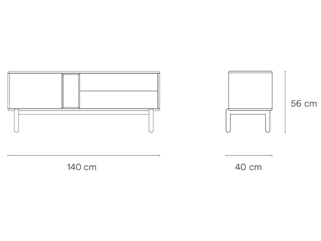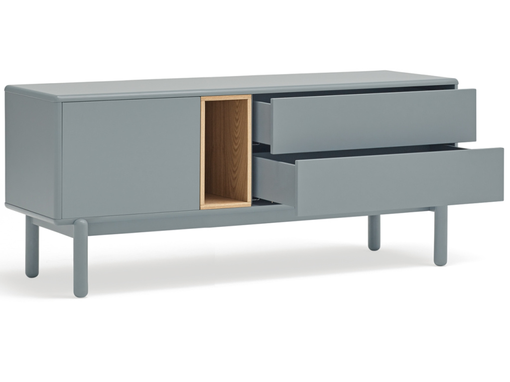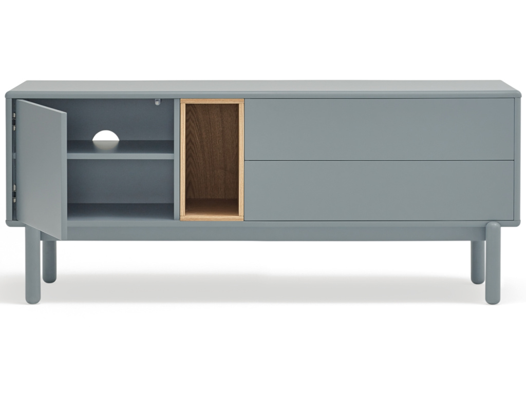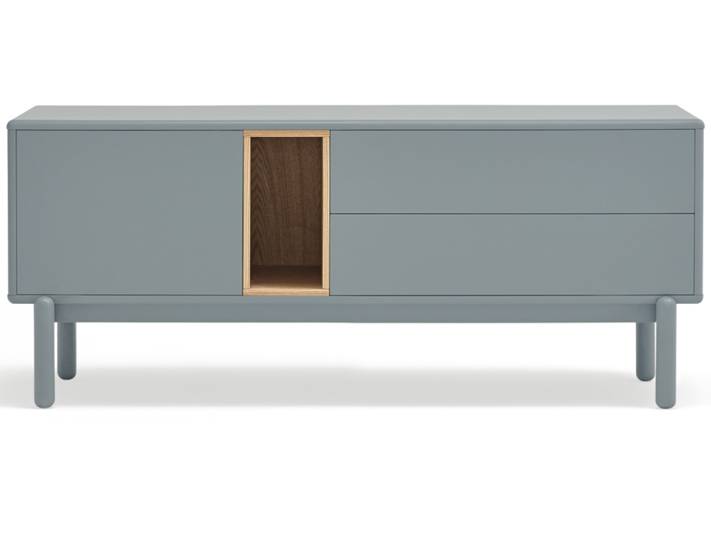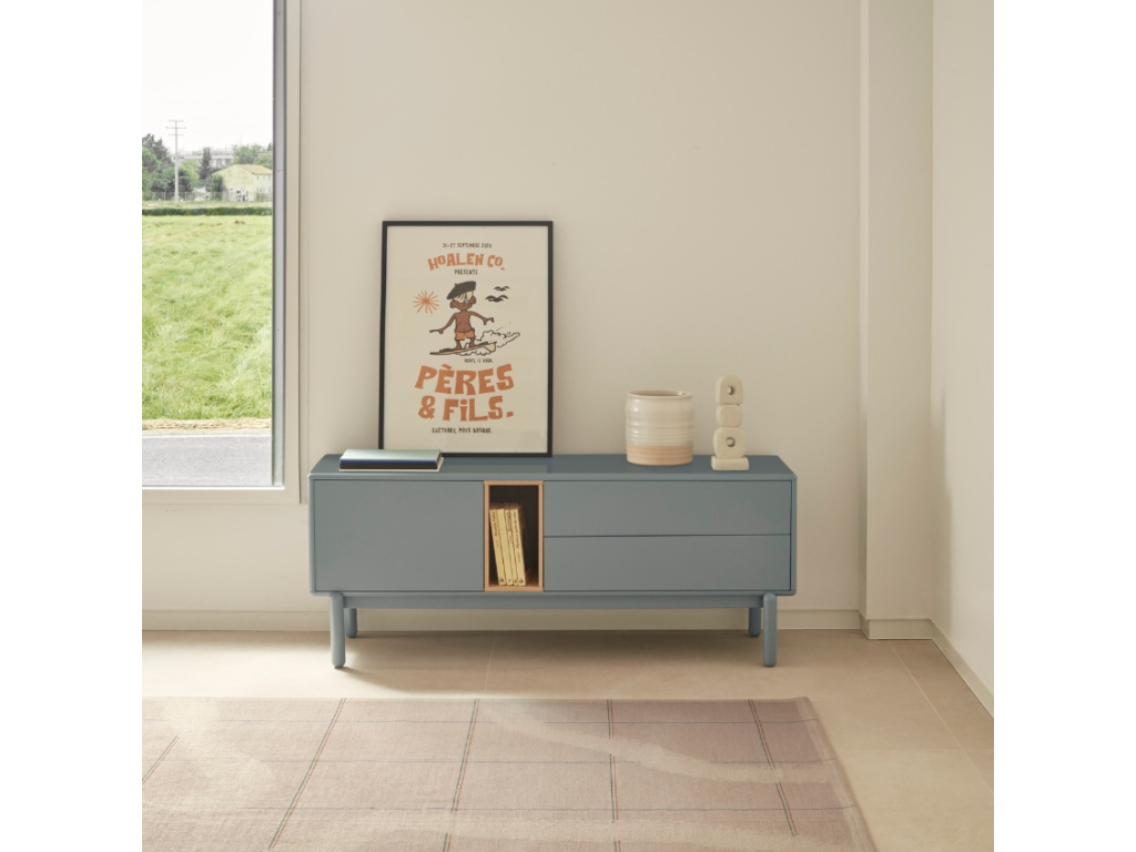 Televizní stolek Teulat Corvo v šedo modré barvě vás na první pohled zaujme svým minimalistickým designem a dostatečně velkým úložným prostorem. Korpus stolku je z lakovaného MDF, které si oblíbíte pro snadnou údržbu. Design stolku zaujme jednou kontrastní policí s dubovou dýhou. Bytelná podnož je z masivního dřeva.