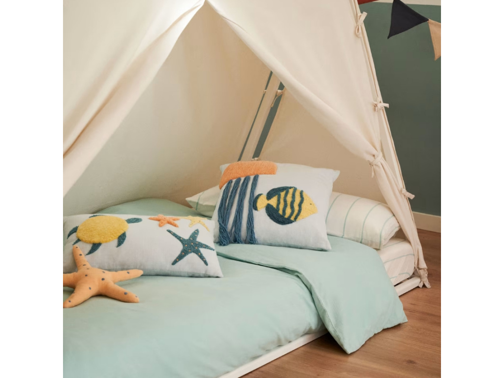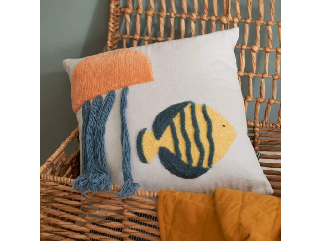 Povlak na polštář Kave Home Cordelia si oblíbí každý malý milovník mořských zvířátek. Zdobí ho rybka a medúza, které díky jejich odlišné textuře na polštářku najdete i poslepu. Medúza má chapadla v podobě provázkovitých střapců, které dodávají polštářku na originalitě. Povlak pochází ze série produktů Cordelia, ve které najdete povlaky a polštářky, které promění dětský pokojík v hravě a barevné mořské dno.