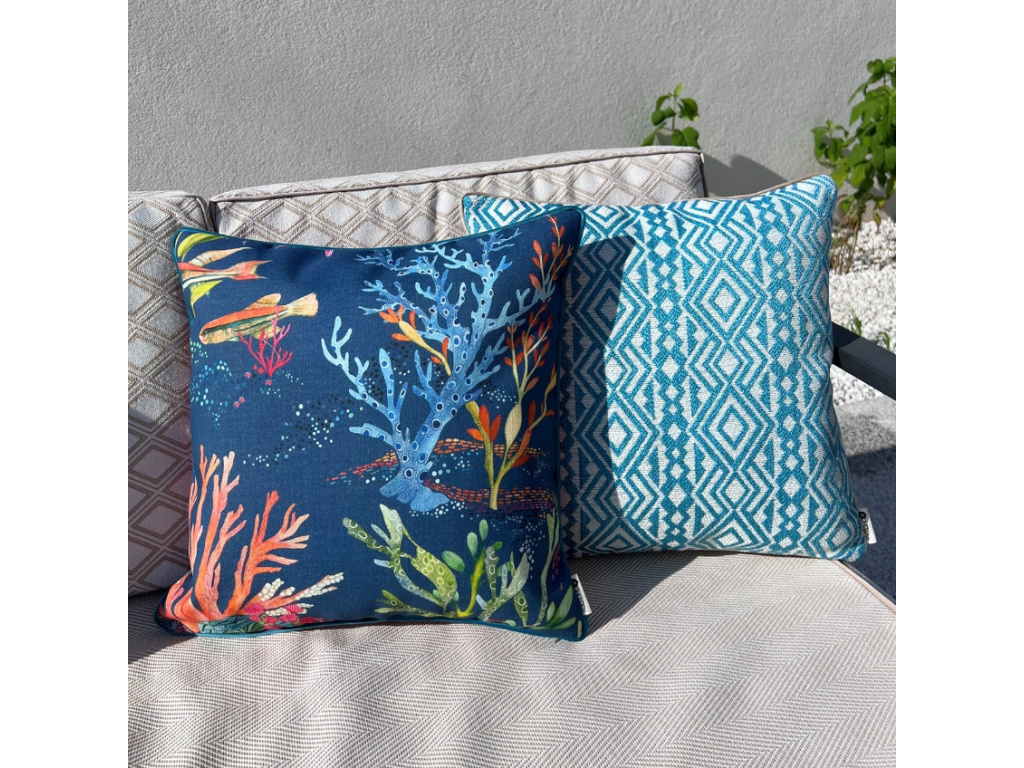Modrý set dvou venkovních povlaků na polštář od české značky BOHOLOGY je vyroben z kvalitních anglických látek Osborne&Little. Povlak Marine má na jedné straně motiv podmořského světa a povlak Aztec je s aztéckým vzorem. Druhá strana obou povlaků je jednobarevná, takže můžete polštáře otáčet a obměňovat podle nálady. Jsou vhodné jak do interiéru, tak exteriéru, kde snesou nečekaný déšť. Po stranách mají skrytý zip, díky čemuž se dají pohodlně sundat a prát.