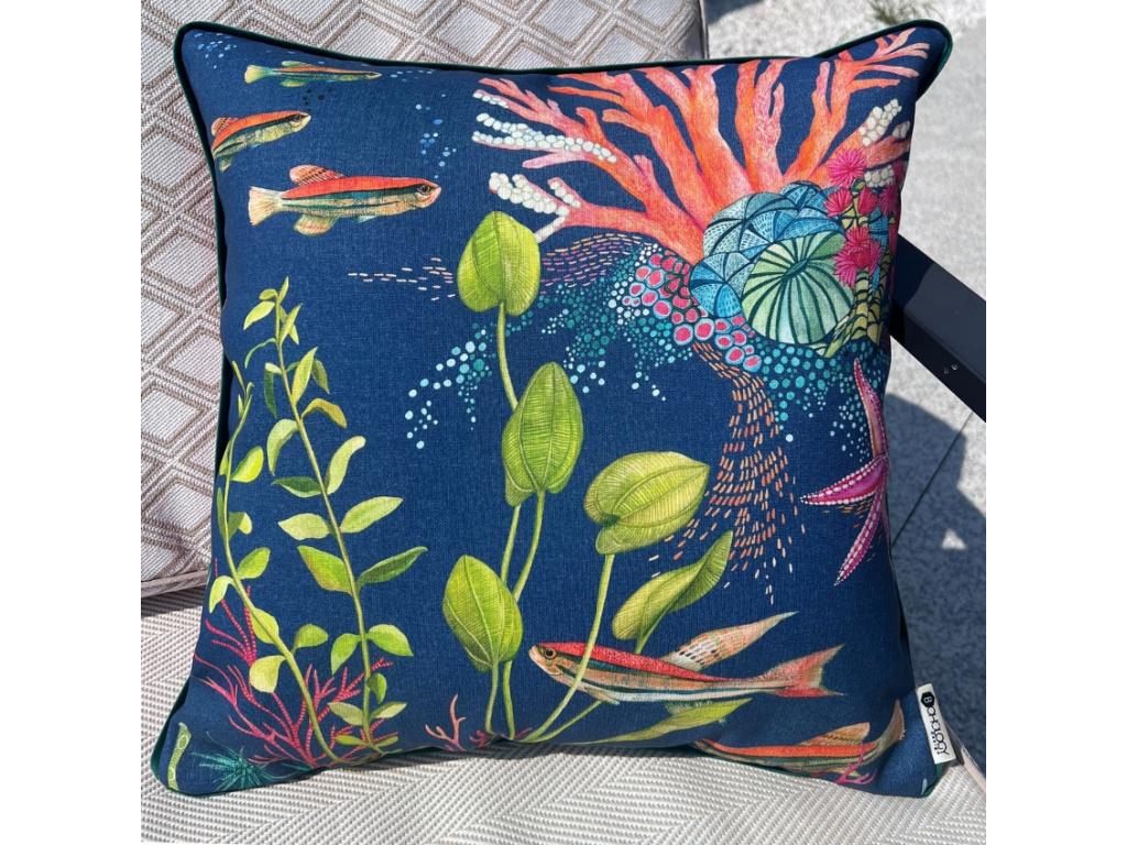 Povlak na polštář Marine od české značky BOHOLOGY zaujme na první pohled originálním motivem podmořského světa. Je ušitý z kvalitních anglických látek Osborne&Little, které se vyznačují výraznými barvami a nádhernými vzory, které vznikají pod rukama světových návrhářů. Tyto látky jsou vhodné do interiéru i exteriéru, kde snesou i náhlý letní déšť. Druhá strana povlaku je jednobarevná, takže pokud zatoužíte po změně, můžete polštář kdykoliv otočit a vzor tak na chvíli skrýt. Po straně se ukrývá zip, díky čemuž lze povlak jednoduše sundat a vyprat. Marine se rychle stane vaším oblíbeným společníkem při venkovním posezení, které si můžete libovolně nakombinovat spolu s dalšími povlaky z této řady.