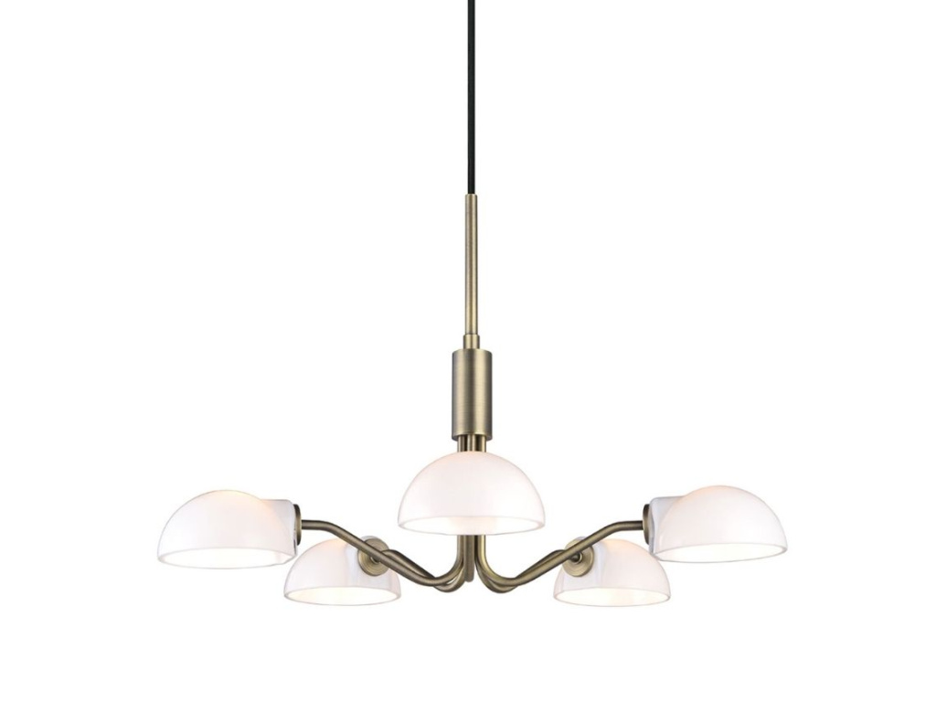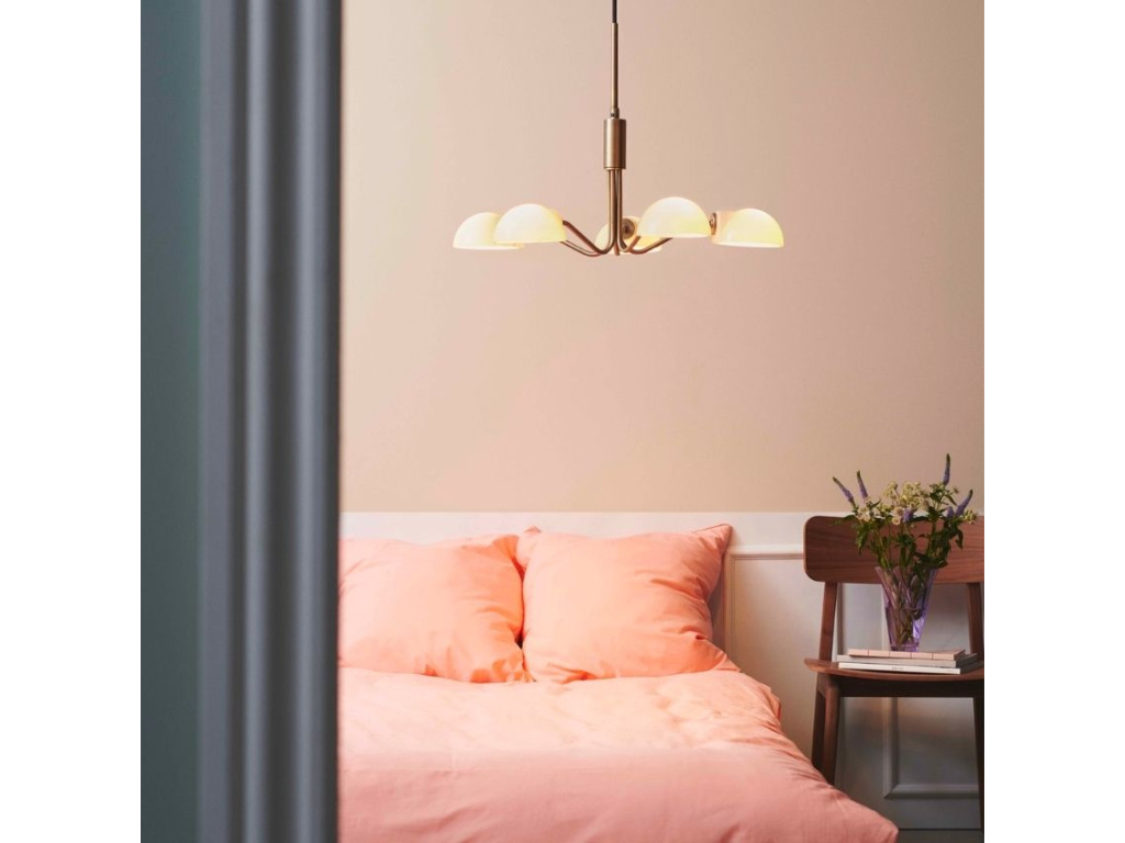 Závěsné světlo Kjobenhavn značky Halo Design vás zaujme svým elegantním designem. Kombinuje v sobě tradiční prvky s prvky moderní funkčnosti. Najdete na něm celkem pět stínidel z opálově bílého skla, která jsou umístěna na zavěšení z mosazně lakovaného kovu. V sérii Kjobenhavn najdete více druhů stínidel, s kterými můžete skvěle sladit osvětlení v celé domácnosti.