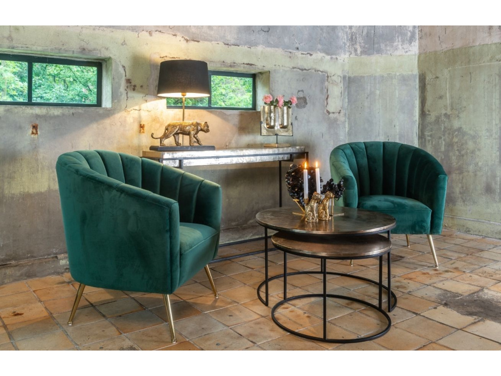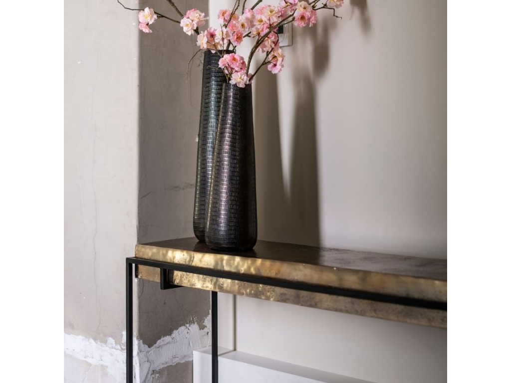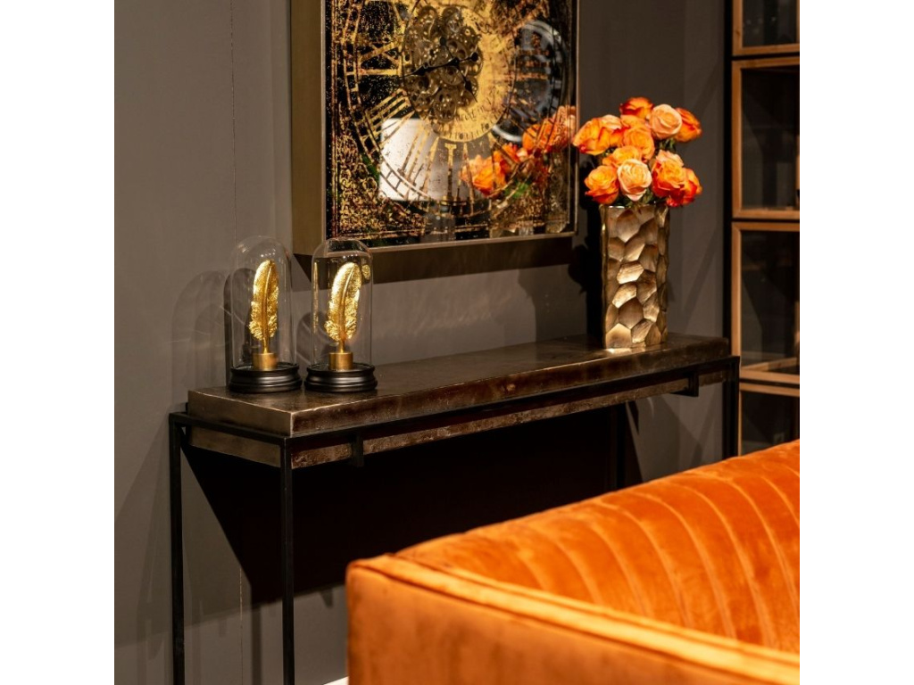 Toaletní stolek Calloway značky Richmond zaujme svým neobyčejným designem. V interiéru skvěle vynikne a stane se jeho nepřehlédnutelnou ozdobou. Stolek je tvořen černou kovovou podnoží, do které je vsazen kovový kvádr mosazné barvy, který plní funkci odkládací desky.