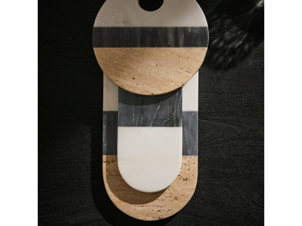 Kolekce kuchyňských doplňků Nivol přináší elegantní řešení pro každodenní servírování i slavnostní momenty. Toto oválné prkénko je vyrobeno z kvalitních přírodních materiálů, jako je bílý, černý mramor a travertin, které zajišťují nejen estetickou hodnotu, ale i dlouhou životnost. V kolekci mimo to naleznete sady podtácků a další servírovací prkénka různých tvarů a velikostí. Díky svému minimalistickému vzhledu a neutrálním tónům se skvěle hodí do světlých, moderních interiérů, skandinávských kuchyní či komerčních prostor, kde vynikne jeho sofistikovaná jednoduchost. Kolekce Nivol je ideální volbou pro ty, kteří hledají funkční a zároveň designově vytříbené doplňky.