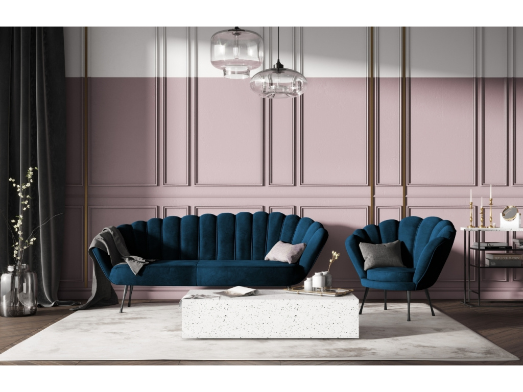Křeslo Kingston značky Cosmopolitan Design představuje spojení elegance a neotřelého vzhledu. Jeho jemně lesklé sametové čalounění v námořnicky modrém odstínu je hebké a příjemné na dotek. Tkanina je velmi odolná proti oděru a absorpci tekutin, čímž zaručí dlouhodobé používání bez známek opotřebení. Celkový design křesla doplňuje černě lakovaná kovová podnož. Pro dokonale sladěný sedací kout doporučujeme křeslo doplnit o pohovku ze stejnojmenné série. Křeslo je dostupné v 11 barevných provedeních, od šedých tónů až po výrazné a pestré barvy. Užijte si pohodlí a styl v jednom!