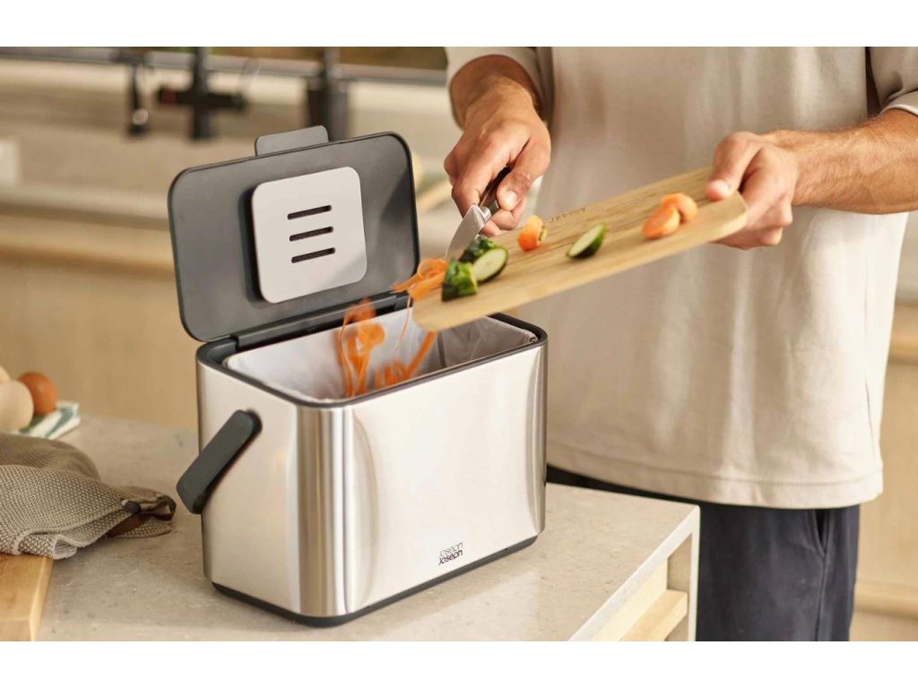 Učiňte vaření a přípravu jídel ještě praktičtější se stylovou nádobou na kompostovatelný odpad z nerezové oceli Collect. Pomocí výměnného uhlíkového filtru ve víku nádoby redukuje zápach, který se přirozeně uvolňuje ze shromážděných zbytků jídla. Nádoba je dodávána s odnímatelným vnitřním košem, který lze samostatně vynést. Pod vnitřním košem najdete v nádobě prostor pro uložení balení sáčků na bioodpad.