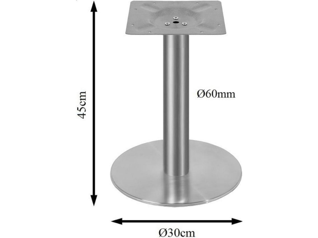 Vysoce kvalitní nerezová stolová podnož vhodná jako podstavec pro jídelní stoly, bistro stolečky či restaurační a kavárenské stoly. Centrální stolová podnož se skládá z montážní plotny čtvercového tvaru pro upevnění stolové desky, stolové nohy a těžké kulaté základny, která zaručuje vysokou stabilitu. Díky spodní pogumované části stojanu nehrozí poškrábání podlahy ani podkluzování stolku.