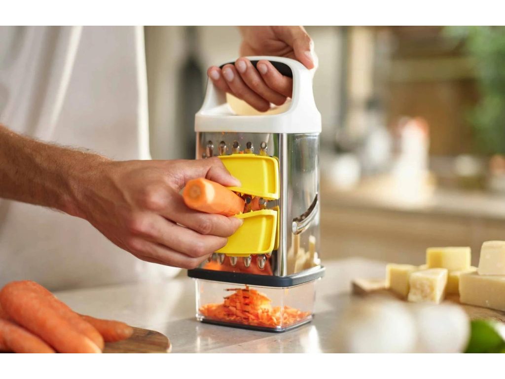 Struhadlo Multi-Grip od Joseph Joseph s inovativním držákem je skvělým pomocníkem pro bezpečné strouhání potravin. Precizní tvar držáku zajišťuje bezpečné strouhání malých i velkých kousků. Nejmenší kousky surovin lze držákem uchopit jako malými kleštičkami. Bezpečně tak můžete strouhat nebo plátkovat ředkvičky i malé stroužky česneku. Struhadlo z nerezové oceli nabízí tři stupně hrubosti a plátkovací břit. Ve spodní části struhadla se nachází průhledná sběrná miska s odměrnými ryskami a protiskluzovou základnou. K dobré stabilitě přispívá i ergonomický tvar madla.