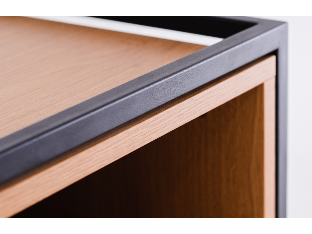 Kolekce modulárních úložných prostor Skipo představuje stylový nábytek, který si jednoduše nakombinujete podle vašich představ. Najdete v ní několik velikostí skříněk, které mohou být využity jako knihovny, komody, noční stolky nebo třeba TV stolky. Zkrátka je použijte tam, kde je potřeba! Spojení dubového dekoru a kovového rámu je nadčasové a skvěle zapadne do minimalistických i industriálních prostor. Tato nízká verze komody Skipo disponuje třemi otevřenými policemi a jednou uzavřenou policí s dvířky, dostupná je také v černém provedení.