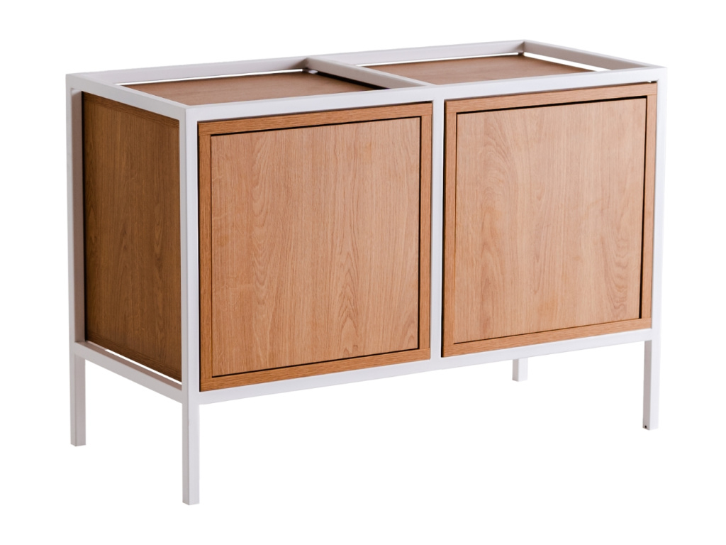 Kolekce modulárních úložných prostor Skipo představuje stylový nábytek, který si jednoduše nakombinujete podle vašich představ. Najdete v ní několik velikostí skříněk, které mohou být využity jako knihovny, komody, noční stolky nebo třeba TV stolky. Zkrátka je použijte tam, kde je potřeba! Spojení dubového dekoru a kovového rámu je nadčasové a skvěle zapadne do minimalistických i industriálních prostor. Tato nízká verze komody Skipo disponuje dvěma prostornými uzavřenými policemi, dostupná je také v černém provedení.