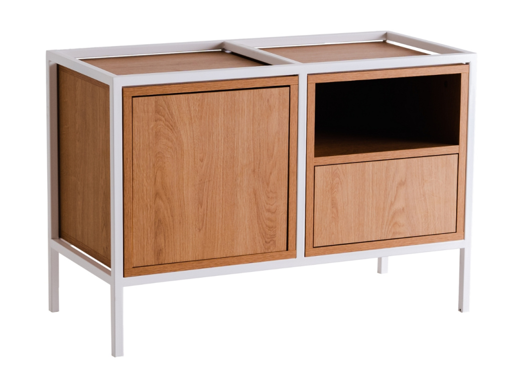 Kolekce modulárních úložných prostor Skipo představuje stylový nábytek, který si jednoduše nakombinujete podle vašich představ. Najdete v ní několik velikostí skříněk, které mohou být využity jako knihovny, komody, noční stolky nebo třeba TV stolky. Zkrátka je použijte tam, kde je potřeba! Spojení dubového dekoru a kovového rámu je nadčasové a skvěle zapadne do minimalistických i industriálních prostor. Tato nízká verze komody Skipo disponuje jednou uzavřenou a jednou otevřenou policí a také praktickou zásuvkou, dostupná je také v černém provedení.