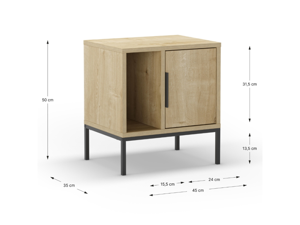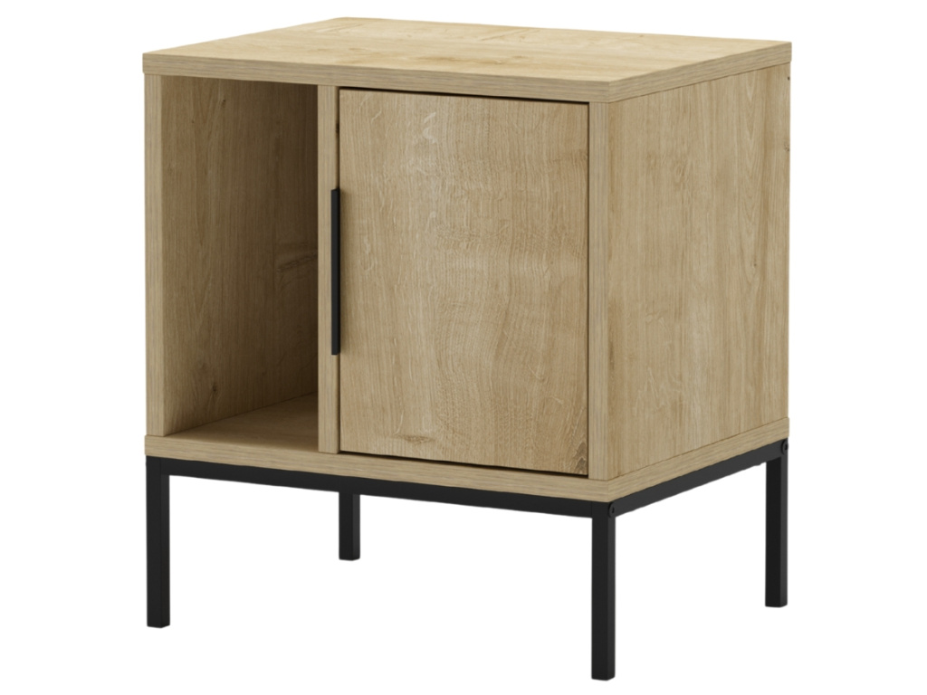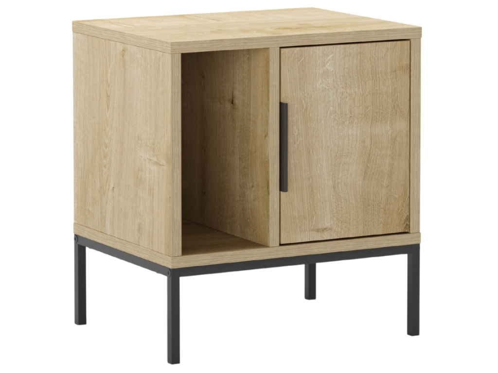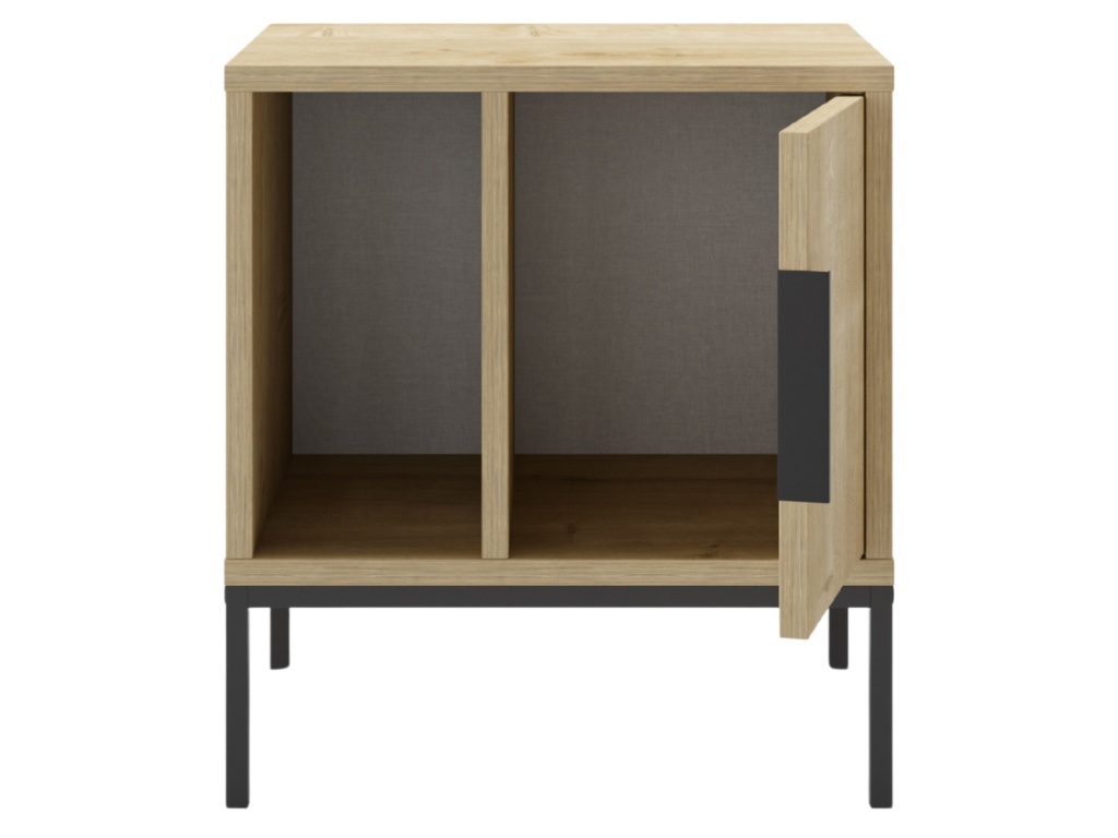 Noční stolek Lani zaujme přírodní kresbou dubového dekoru a minimalistickou kovovou podnoží. Nabízí praktickou kombinaci uzavřené skříňky a otevřené police, jejíž zadní stěna je ozvláštněna jemnou texturovanou tapetou. Tento detail dodává stolku vizuální hloubku a dělá z něj stylový doplněk ložnice. Kromě varianty v dekoru dubu je dostupný také v elegantní bílé.