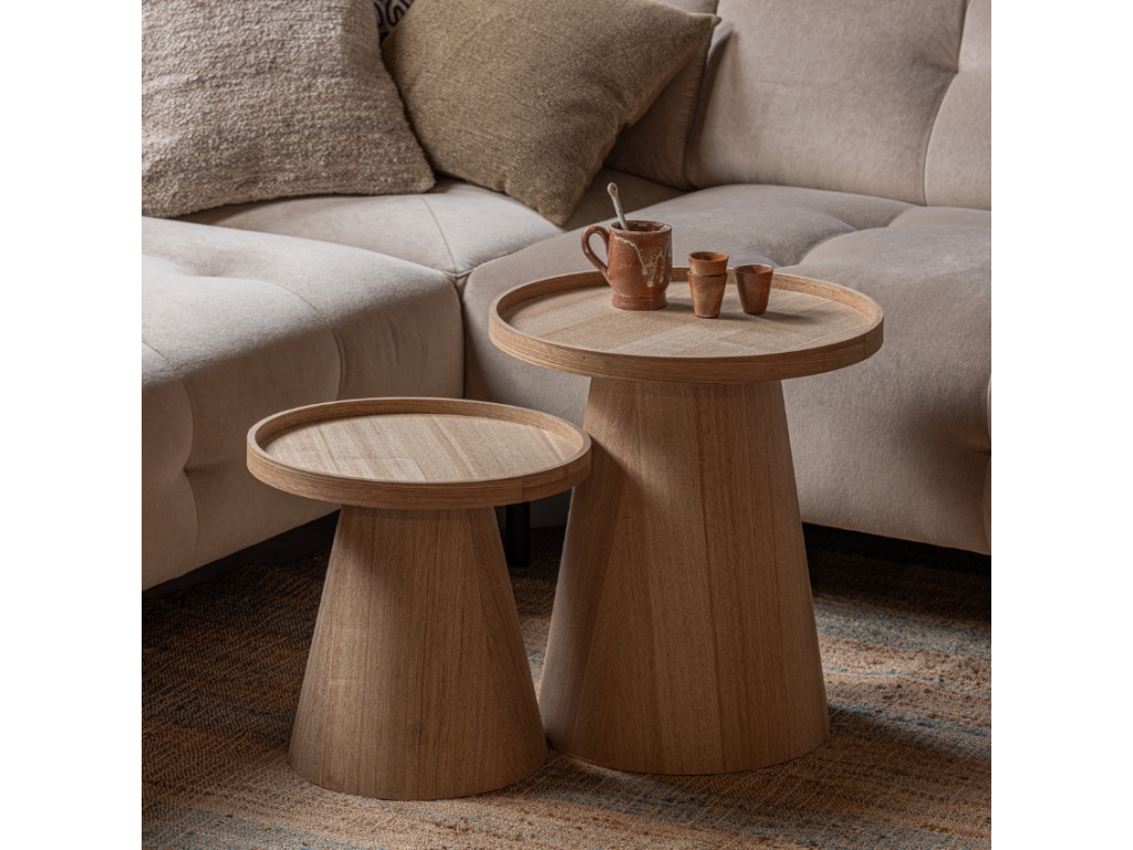 Odkládací stolek Daum od značky Hoorns osloví především nadšence přírodních materiálů. Stolek je navržen v duchu minimalismu a zaujme na první pohled svou zajímavou kuželovou podnoží. Odkládací deska nabízí vyvýšenou hranu, díky čemuž nehrozí, že z ní něco omylem spadne. Stolek je vyroben z kvalitní MDF desky, která se vyrábí z lisovaných dřevěných vláken a ty jsou pak lepeny pod vysokým tlakem pryskyřicí, což dodává stolku velice hladký povrch. Skvěle bude vypadat především v interiérech v boho stylu a moderních světlých interiérech. K dispozici také v menší velikosti.