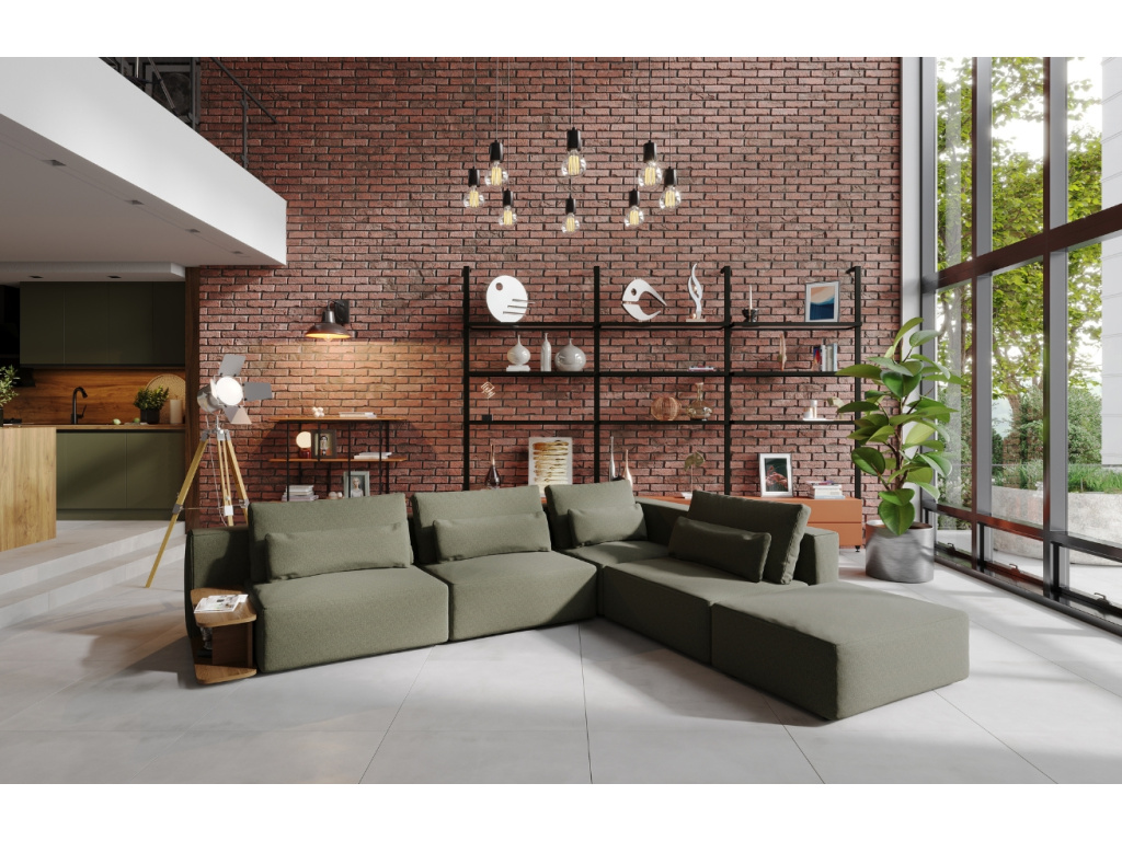 Více infoOlivově zelená čalouněná rohová pohovka Riposo 330 cm se stolkem