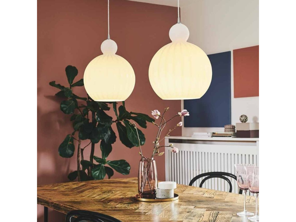 Elegantní závěsné světlo Halo Design Ball Ball vás zaujme svým originálním a hravým tvarem. Přesně jak název napovídá, stínidlo z opálově bílého skla totiž vypadá jako míč. Díky jeho jemným křivkám a zdobným vertikálním liniím se světlo stane ozdobou interiéru a přinese s sebou útulné osvětlení. Ball Ball můžete mít ve třech různých barvách a ve velikostech 15 cm, 25 cm nebo 32 cm.