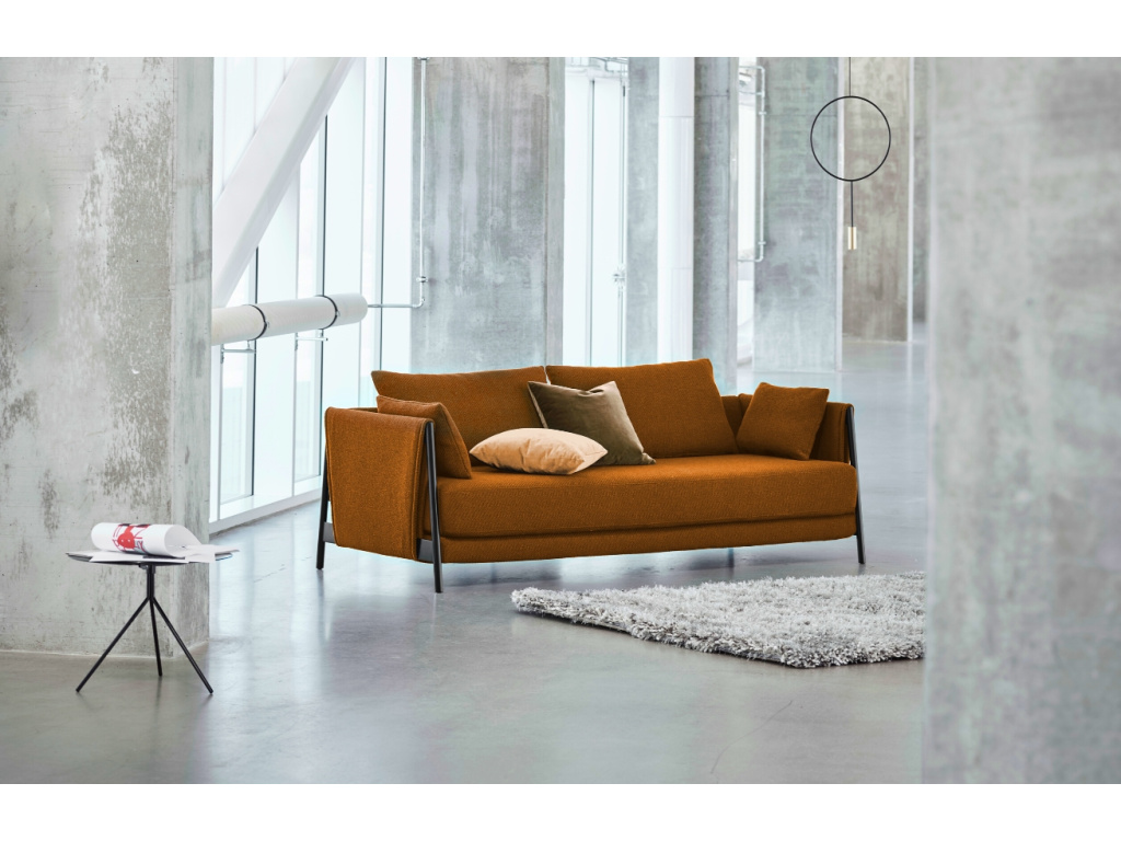 Dvoumístná pohovka Softline Madison zaujme již na první pohled svou robustností. Mohutné sedací polštáře ve strukturované látce jsou obklíčeny ze všech stran masivní černě lakovanou kovovou konstrukcí, díky čemuž získává na stabilitě a odolnosti. Područky a jejich jedinečné potažení látkou, je zároveň designovým prvkem, díky kterému se pohovka odlišuje od ostatních. Jako skrytý prvek v sobě ukrývá možnost pohovku rozložit a přeměnit jej tak snadno na lůžko pro hosty. Pohovka se díky odolnosti skvěle hodí nejen do komerčních prostor, ale také do domácího prostředí.