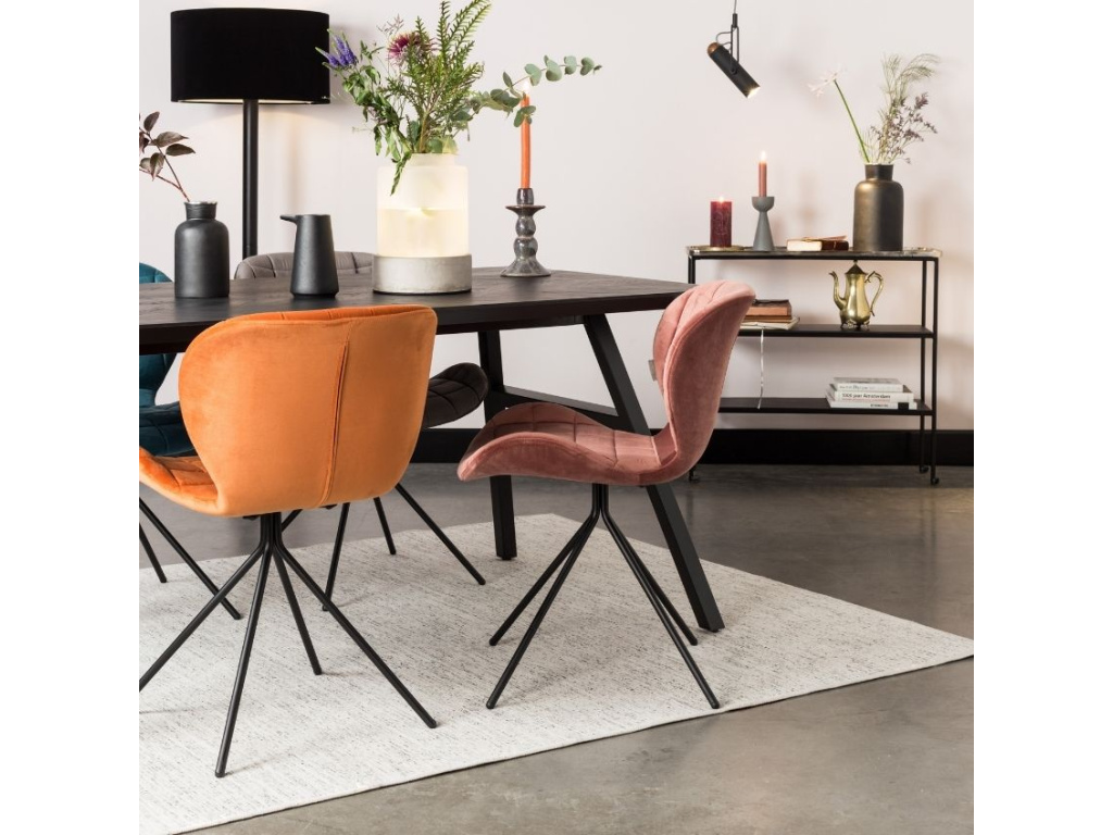 Elegantní designová čalouněná jídelní židle ZUIVER OMG. Základnu sedáku z kvalitní sametové látky v oranžové barvě tvoří překližka pokryta tenkou vrstvou pěny, díky které si budete moci vychutnat úžasné pohodlí, a to beze strachu pádu, které Vám zaručí pevná ocelová podnož v elegantním černém provedení.