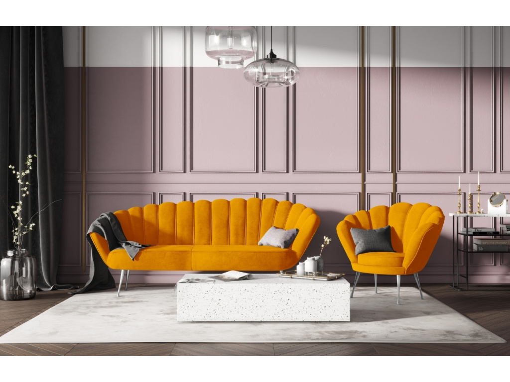 Třímístná pohovka Kingston značky Cosmopolitan Design se vyznačuje jemným prošíváním, které jí dodává elegantní a vzdušný vzhled. Jemně lesklé sametové čalounění v oranžovém odstínu je hebké a příjemné na dotek. Tkanina je velmi odolná proti oděru a absorpci tekutin, čímž zaručí dlouhodobé používání bez známek opotřebení. Celkový design pohovky doplňuje stříbrná kovová podnož. Pro dokonale sladěný sedací kout doporučujeme doplnit pohovku o křeslo ze stejnojmenné série. Pohovka je dostupná v 11 barevných provedeních, od šedých tónů až po výrazné a pestré barvy. Užijte si pohodlí a styl v jednom!