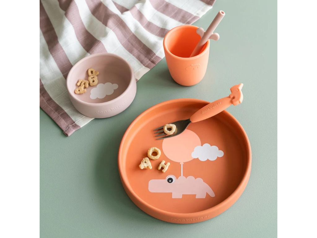 Tato jídelní sada pomůže všem malým jedlíkům samostatně jíst své pokrmy. Silikonový povrch zajistí, že nádobí nebude sklouzávat ze stolu. Kelímek je tvarovaný tak akorát do malé dětské ručičky, a zaoblené vnitřní hrany misky a talíře usnadní nabírání jídla. Sada je zdobena krokodýlem Crocem na balónku a bílými mráčky. Další produkty s veselými motivy zvířátek z kolekce Deer friends můžete najít pod značkou Done by Deer.