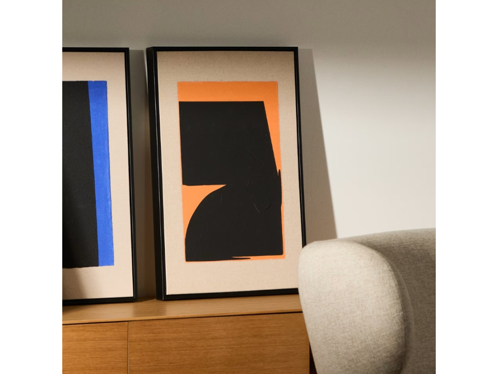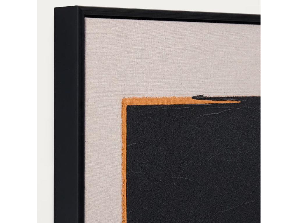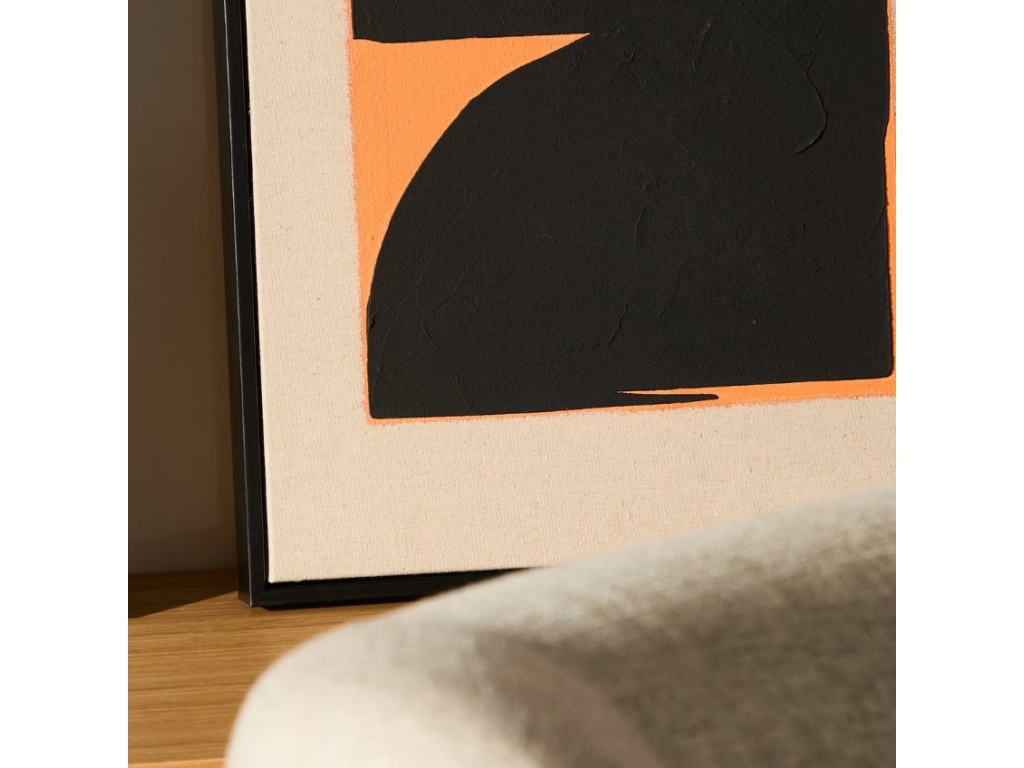 Abstraktní obraz Zernu zaujme hrou kontrastů – černá barva v kombinaci s oranžovou vytváří vizuálně silnou kompozici s efektem světla a stínu. Ruční malba je vytvořena na lněném plátně, jehož povrch je navíc chráněn lakem, což zajišťuje dlouhou životnost a odolnost proti prachu. Díky výrazné textuře, kde se střetává hrubost malby s jemností tkaniny, každý kus přirozeně vynikne jako solitér – nebo vytvoří působivý set spolu s dalšími obrazy z této kolekce. Rám v černé barvě dodává celé kompozici čistý výraz a díky praktickému háčku na zadní straně je zavěšení velice snadné.