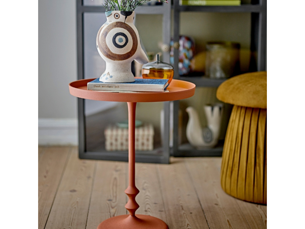 Odkládací stolek Bloomingville Anjou vás upoutá svým lehkým elegantním provedením a zajímavou podnoží s decentními prvky, které ho činí originálním. Stolek je vyrobený z lakovaného hliníku v krásné oranžové barvě, která dodá interiéru svěžest a bude perfektně kontrastovat s neutrálními barvami nábytku. Díky jeho lehkosti ho snadno přemístíte ke své oblíbené pohovce či křeslu. Pokud se vám na stolku převrhne šálek čaje, tak nemusíte zoufat díky desce s praktickým okrajem. Stolek skvěle vynikne v moderním i vintage interiéru.