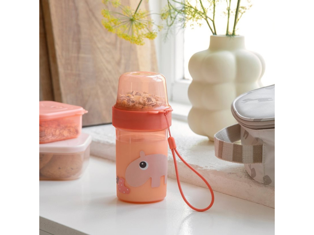 Praktický svačinový kelímek od Done by Deer zaručí, že budou mít děti čerstvou svačinku stále po ruce. Skládá se ze dvou nádob a silikonového víčka s těsněním. Díky tomu můžete do jedné nádoby dát například jogurt a tu druhou naplnit třeba oříšky, granolou nebo ovocem. Kelímek je v jednoduchém designu s motivem roztomilého hrocha Ozza a ptáčka Birdeeho. Z boku najdete také praktický popruh pro snadné přenášení.