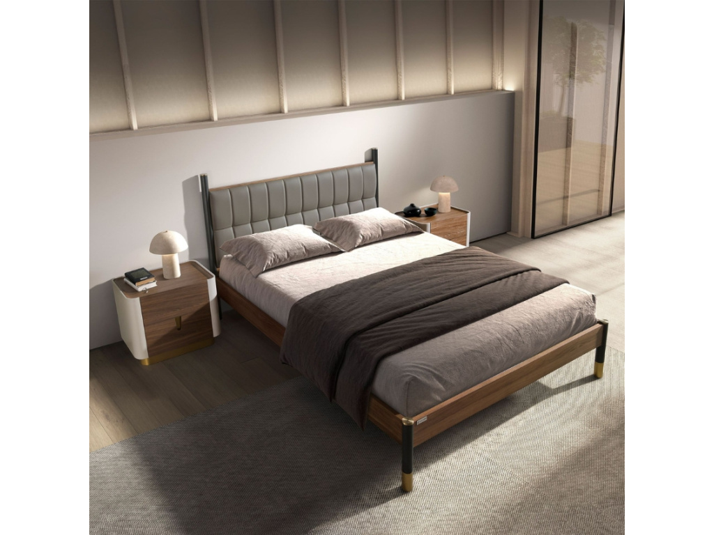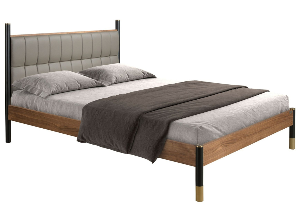 Dopřejte své ložnici nádech moderní elegance s dvoulůžkovou postelí Angel Cerdá, která v sobě spojuje vytříbený design a pohodlí pro každodenní odpočinek. Dominantou této postele je výrazné čelo čalouněné tmavě šedou koženkou, které působí luxusně a zároveň útulně. Její dřevěná konstrukce s přírodní ořechovou dýhou a černé nohy z lakovaného MDF dodávají celku harmonii, stabilitu a osobitý styl. Součástí je i pevný rošt z borovicového dřeva, který zajistí ideální oporu pro vaši matraci o rozměru 160 × 200 cm. Zlaté detaily na podnoži dodávají posteli jemný, ale výrazný designový akcent, který zvýrazňuje její moderní charakter.