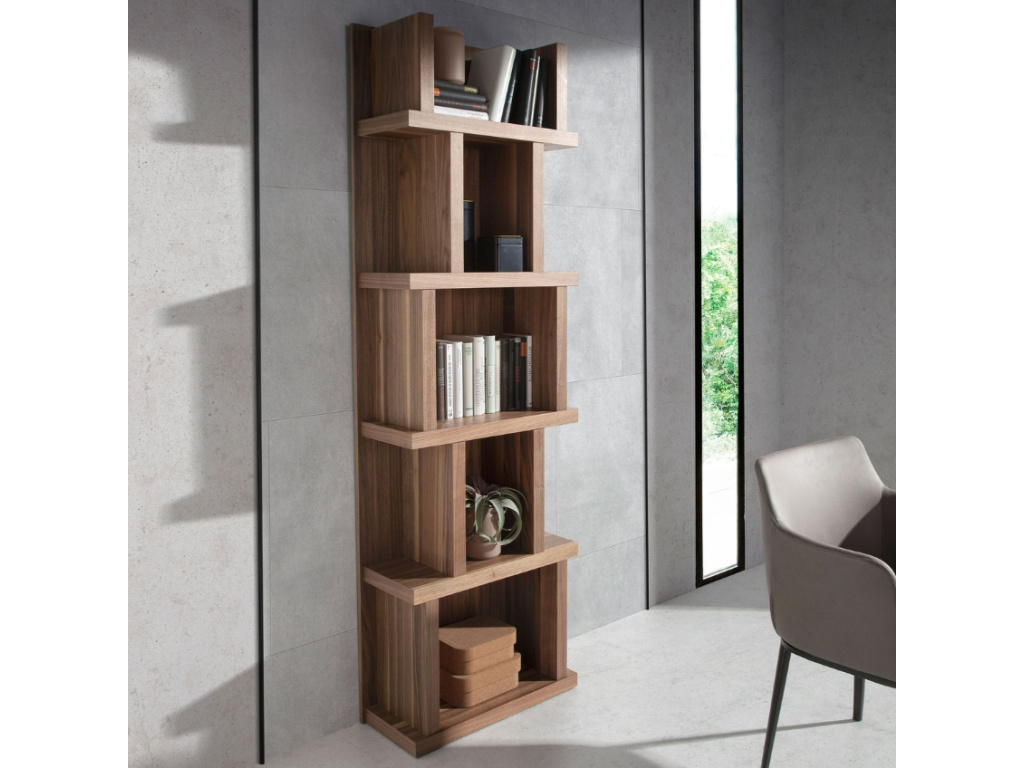 Tato unikátní knihovna z ořechové dýhy spojuje funkčnost a estetiku v jednom harmonickém celku. Její asymetrické policie nabízí dostatek prostoru pro knihy, dekorace či rostliny a dodají vašemu interiéru dynamiku. Přírodní dřevěná textura vnese do místnosti teplý a útulný pocit a originální tvar konstrukce zaujme každého na první pohled. Ideální volba pro interiéry inspirované skandinávským nebo vintage stylem.