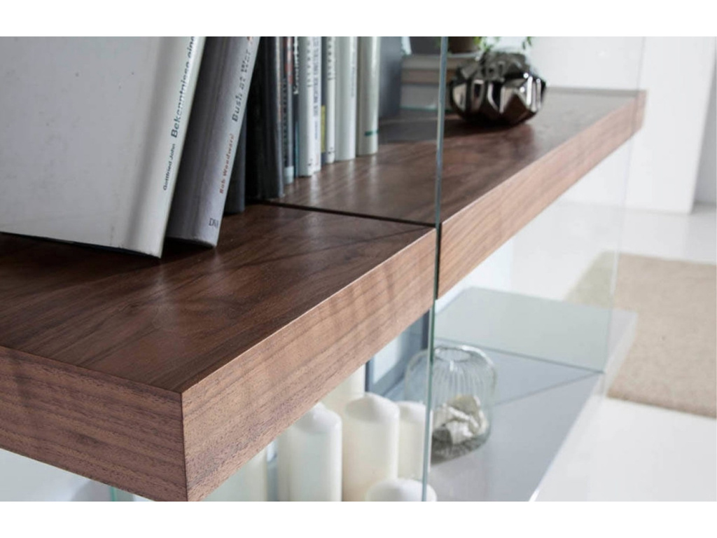 Tato vzdušná knihovna propojuje moderní design s přírodní krásou ořechového dřeva. Kombinace skleněných bočnic a polic v leskle perleťové šedé MDF vytváří dojem lehkosti a otevřenosti a ořechové prvky dodají prostoru útulný charakter a eleganci. Promyšlené uspořádání policie nabídne dostatek místa pro vaše oblíbené knihy i dekorace. Knihovna skvěle zapadne do světlých interiérů s minimalistickým nebo skandinávským laděním.