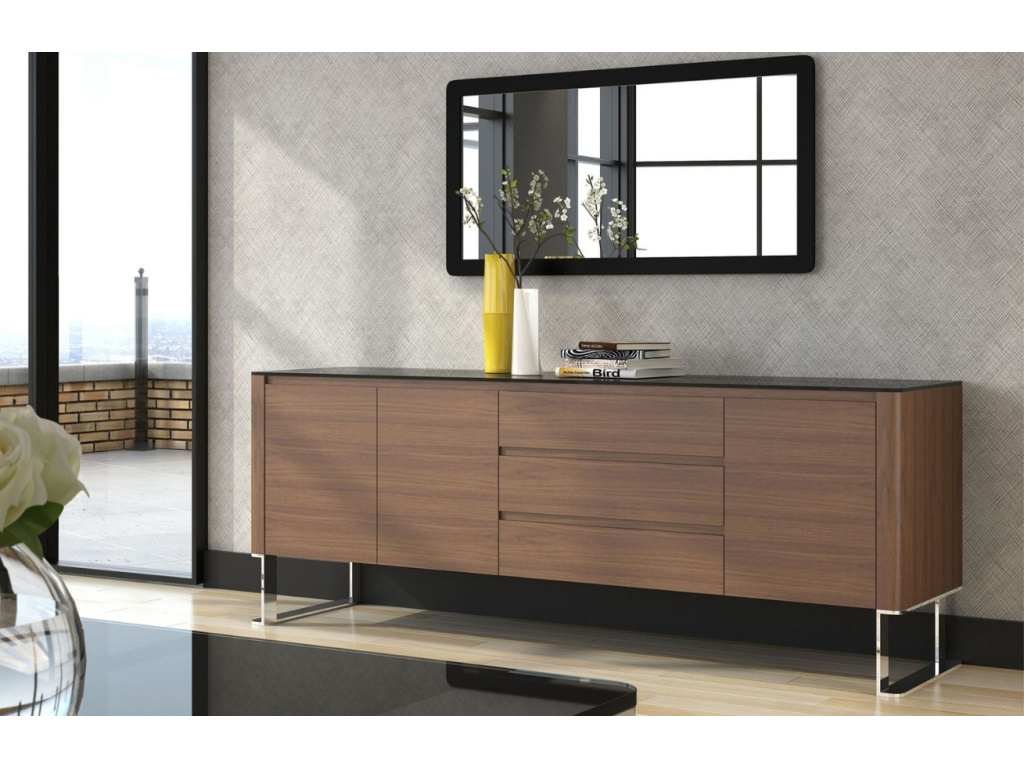 Tato stylová a praktická komoda propojuje moderní design s maximální funkčností. Přírodní ořechová dýha jí dodá útulnost a přirozenou eleganci, zatímco černě tónovaná skleněná deska podtrhne její luxusní vzhled. Tři prostorné zásuvky a dvě uzavřené police se systémem push-to-open zajistí pohodlné a tiché otevírání a praktický úložný prostor. Chromovaná kovová podnož odlehčí celkový dojem a dodá komodě vzdušnost. Perfektně se hodí do elegantních interiérů s nádechem industriálního nebo moderního stylu.