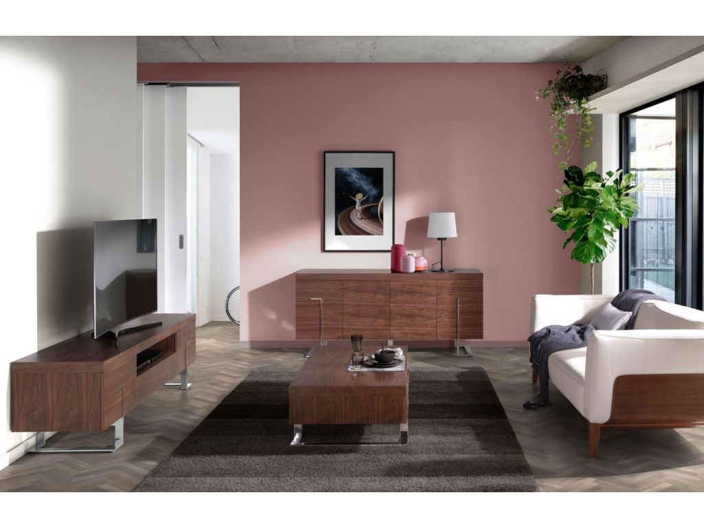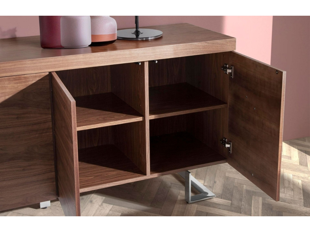 Tato moderní komoda z ořechové dýhy přinese do vašeho interiéru nadčasový styl a praktičnost. Díky velkorysému úložnému prostoru se čtyřmi dvířky snadno uschováte veškeré nezbytnosti. Systém push-to-open zajistí pohodlné otevírání bez rušivých úchytek. Stabilní kovová podnož dodává komodě odlehčený vzhled, který skvěle zapadne do moderních i industriálních prostor. Bude skvělým prvkem v obývacím pokoji či jídelně.