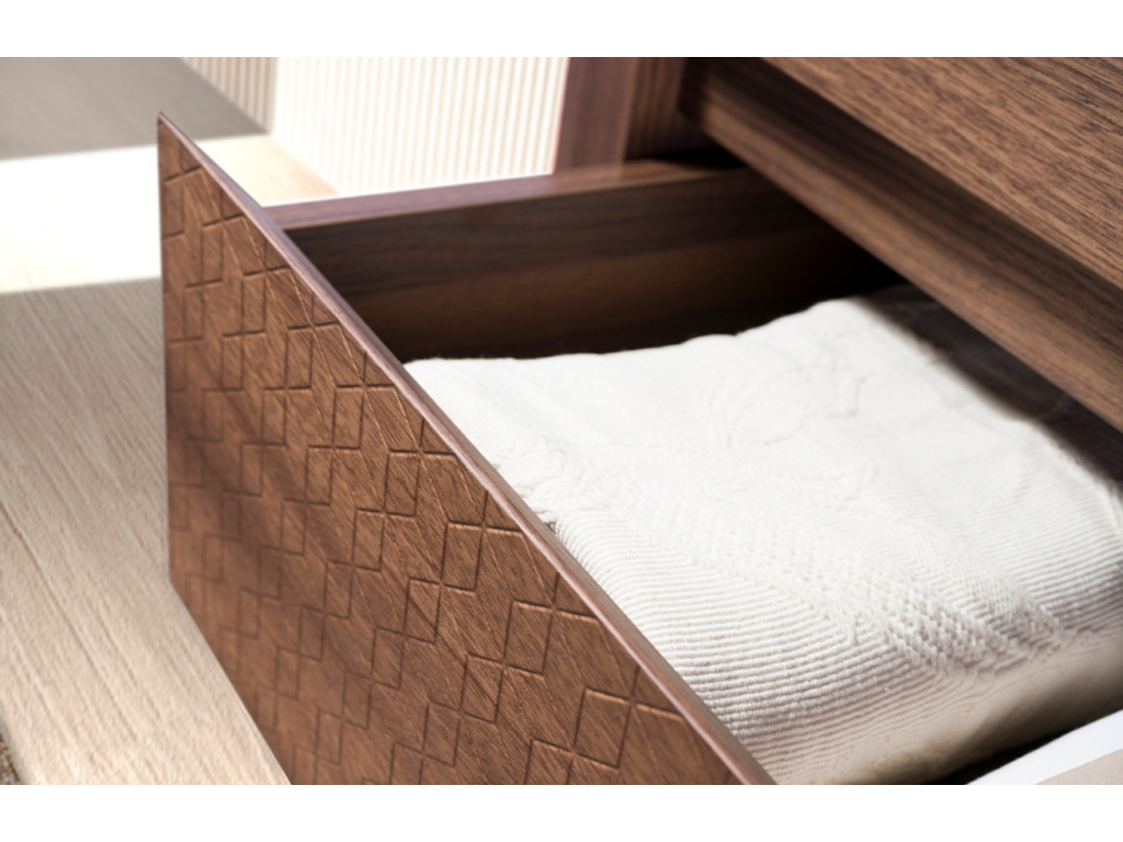 Žádá si váš domov více úložného prostoru? S vysokou komodou od firmy Angel Cerdá ho budete mít dostatek! Díky čtyřem prostorným uzavíratelným policím a široké středové zásuvce nebude uložení vašich věcí už nikdy problém. Komoda si vás získá pro svůj čistý moderní design a kvalitní zpracování ořechové dýhy. Stylovým detailem je zdobná geometrická rytina, kterou je dekorována zásuvka. Zútulněte a zorganizujte si prostor s touto designovou komodou Angel Cerdá.