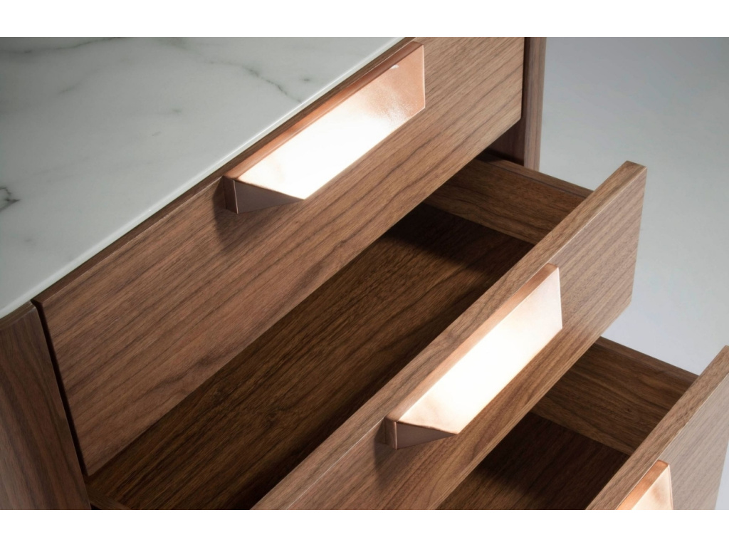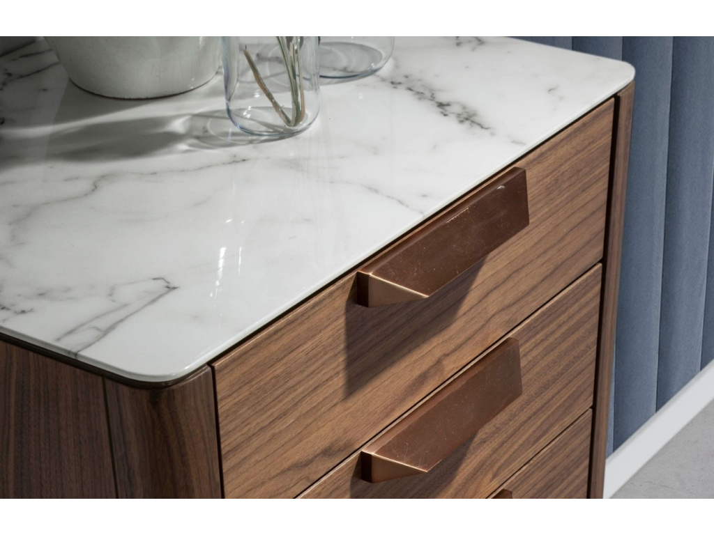 Elegantní vysoká komoda spojuje funkčnost s nadčasovou krásou přírodních materiálů. Ořechová dýha doplněná o porcelánovou desku imitující bílý mramor dodá interiéru jemný luxusní akcent. Pět prostorných zásuvek poskytne dostatek úložného prostoru a díky měkkému zavírání bude jejich používání maximálně komfortní. Subtilní podnož vytváří dojem lehkosti, zatímco precizní zpracování podtrhuje výjimečný charakter tohoto jedinečného kusu nábytku. Ideální do ložnic a chodeb ve stylu moderní elegance nebo art deco.