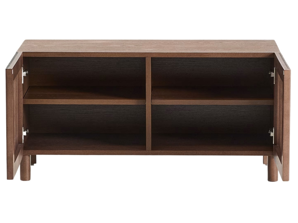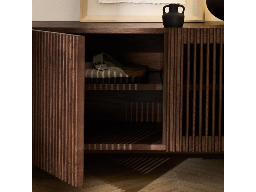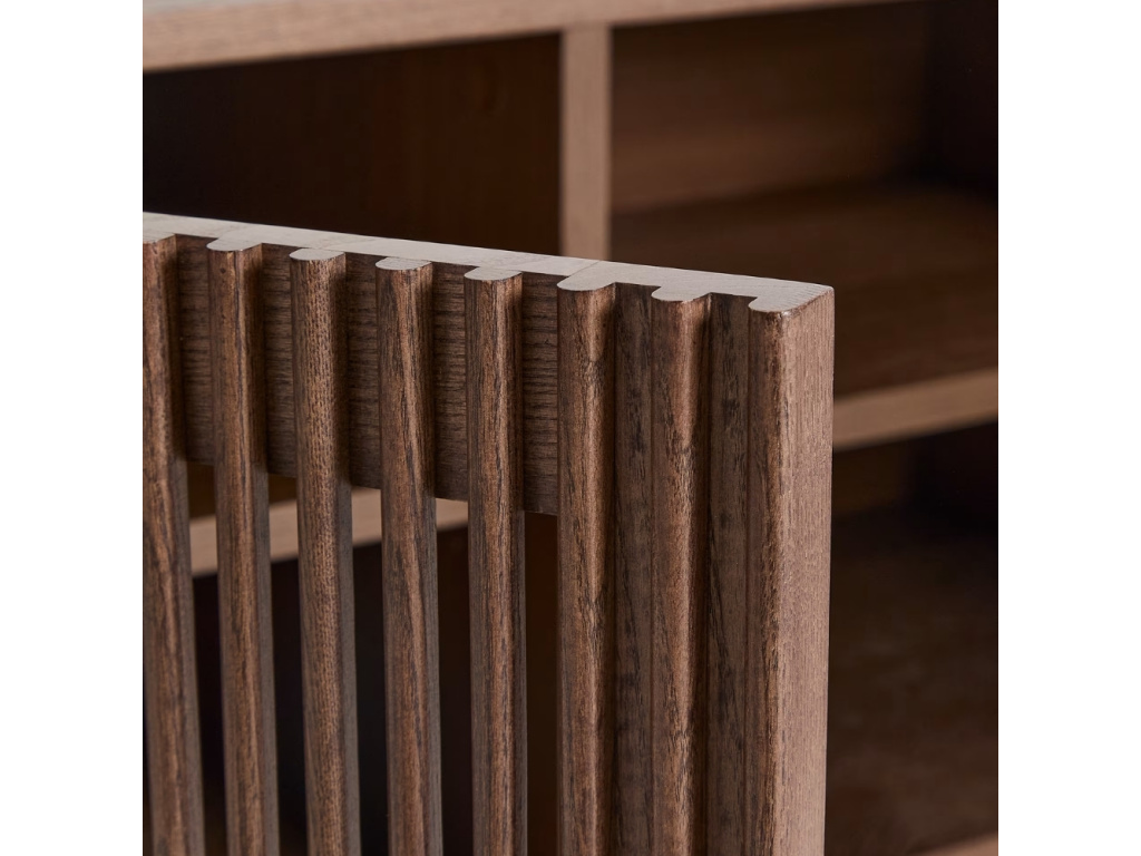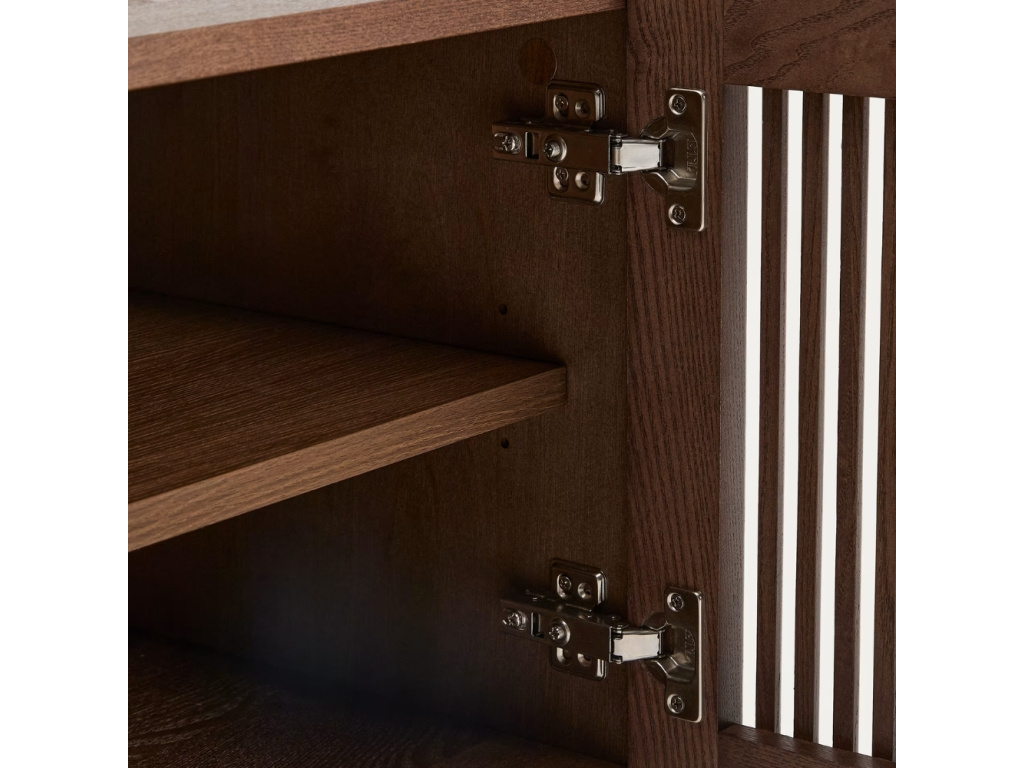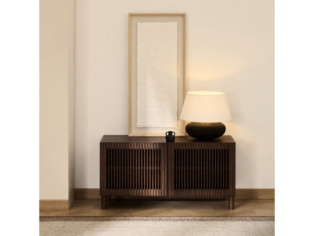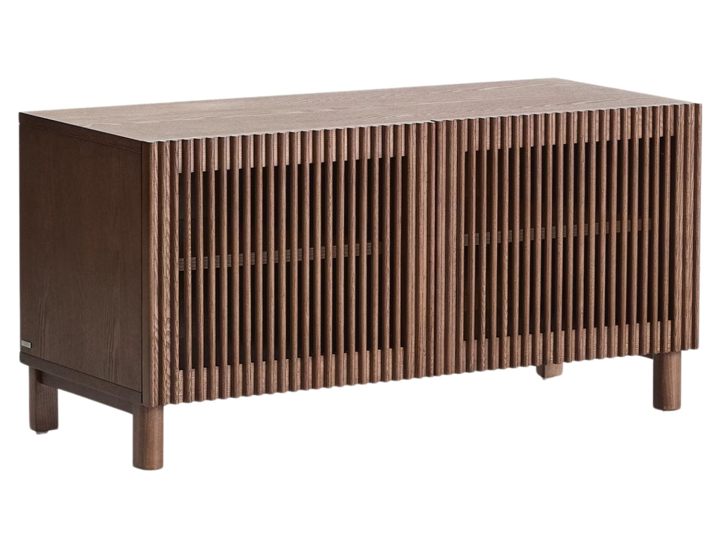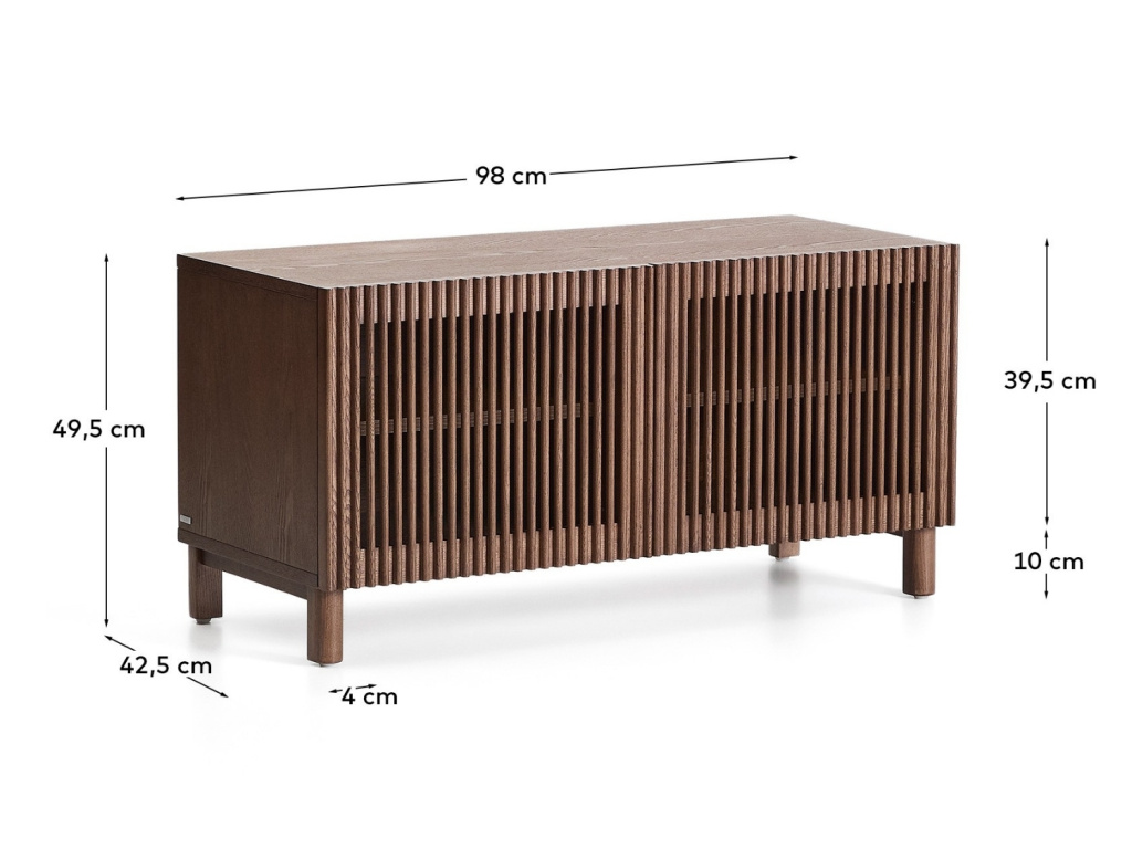 Komoda Beyla je vyrobena z jasanové dýhy, zatímco dvířka a podnož jsou z masivního dřeva – vše s elegantním a hřejivým ořechovým odstínem. Vertikální lamely na dvířkách dodávají kusu vizuální rytmus a hrají si se světlem, které na povrchu vytváří jemné kontrasty. Uvnitř se ukrývá čtveřice polohovatelných polic, díky nimž snadno přizpůsobíte úložný prostor svým potřebám. Díky menším rozměrům tento kousek klidně využijete i v předsíni – jako parktický botník. Beyla je součástí kolekce nábytku, ve které najdete i noční stolek, TV stolek, knihovnu nebo čelo k posteli, což vám umožní vytvořit harmonický a nadčasový interiér v jednotném stylu. Všechen použitý materiál pochází zcertifikovaného FSC™ dřeva, což potvrzuje šetrný přístup k přírodě. Výsledkem je funkční i dekorativní kus nábytku, který vnáší do prostoru útulnou atmosféru, eleganci a dlouhověkost.
