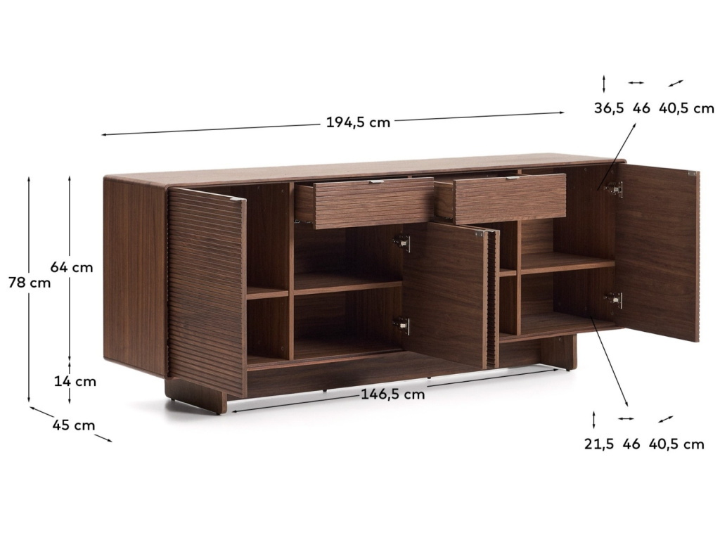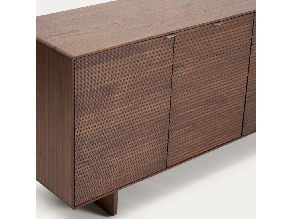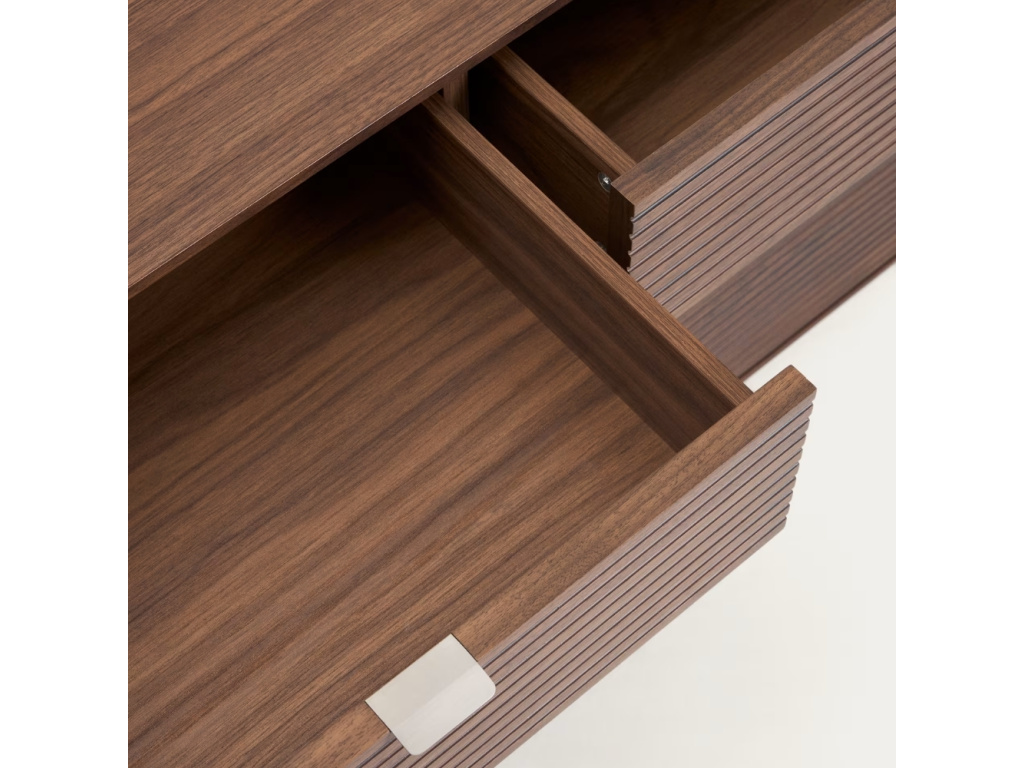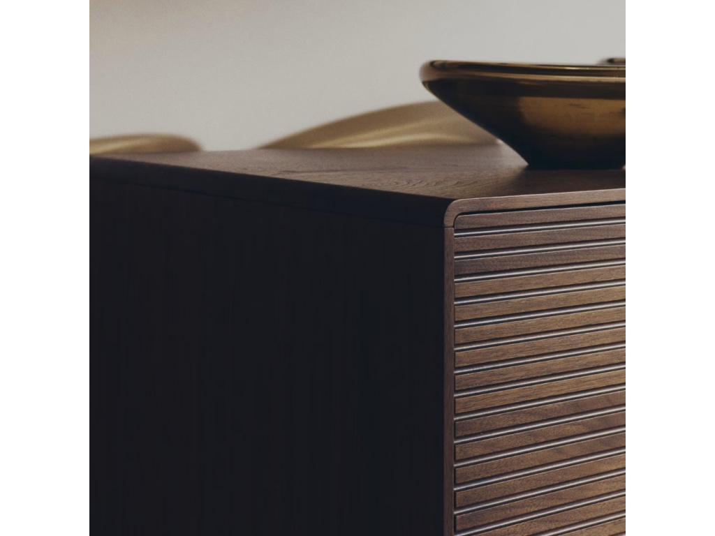Komoda Norlen je elegantní součástí série inspirované designem 50. let, která propojuje vintage atmosféru s moderním pojetím. Tmavá ořechová dýha je na dvířkách ozvláštněna horizontálním frézováním, které se postará o nadčasový dojem. Komoda nabízí praktické úložné řešení, které se přizpůsobí vašim potřebám, aniž by narušilo harmonii designu – dvojice zásuvek a celkem osm uzavřených polic poslouží k uschování věcí, které nechcete vystavovat na obdiv. Díky FSC certifikaci si navíc můžete být jisti odpovědným původem použitého dřeva. Norlen tak není jen komodou, ale promyšleným kusem nábytku, který přinese do interiéru útulnost, funkčnost i možnost dokonale sladit vybraný prostor doplněním dalších produktů ze série.