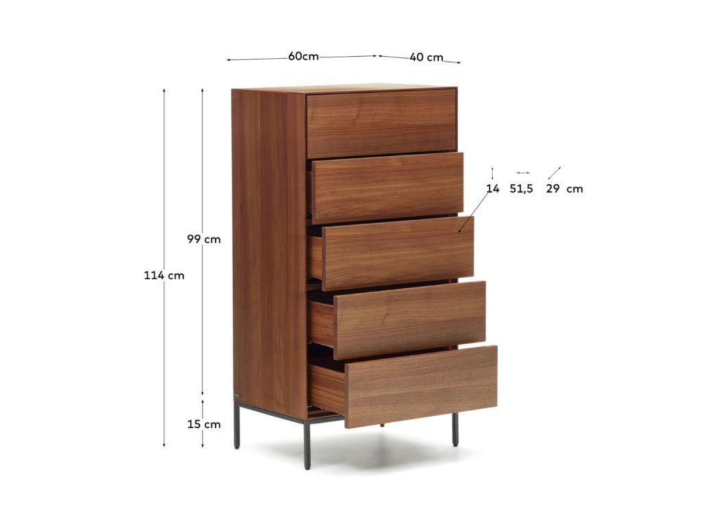 Vysoká komoda Vedrana pochází ze stejnojmenné série nábytku vytvořeného týmem Kave Home. Tyto úložné prostory jsou velice praktické a skvěle se hodí do industriálních i minimalistických interiérů. Spojení ořechové dýhy a vyšší kovové podnože je nejen nadčasové, ale hlavně velice atraktivní. Tato komoda s vyšší podnoží nabízí úložný prostor v podobě pěti prostorných zásuvek. Ty se budou skvěle hodit například ke zorganizování oblečení a spodního prádla Sjednoťte úložné prostory ve vaší domácnosti a vpusťte do ní sérii Vedrana! Vybírat můžete z komod a TV stolků různých velikostí, všechny jsou dostupné v provedení dub i ořech.