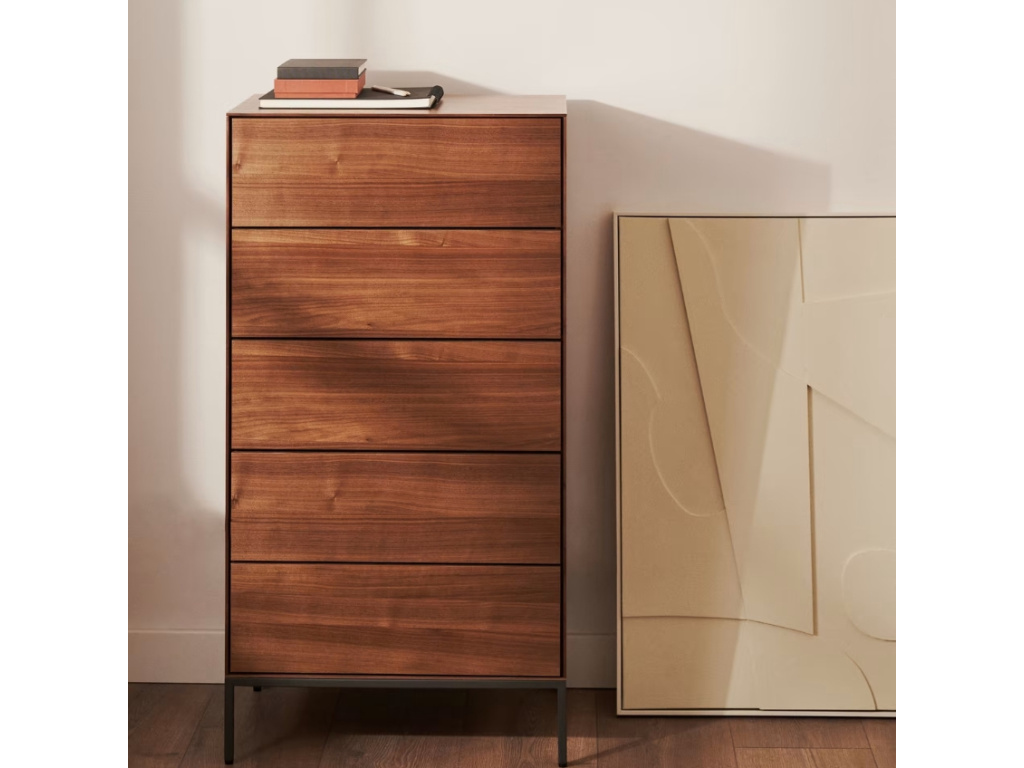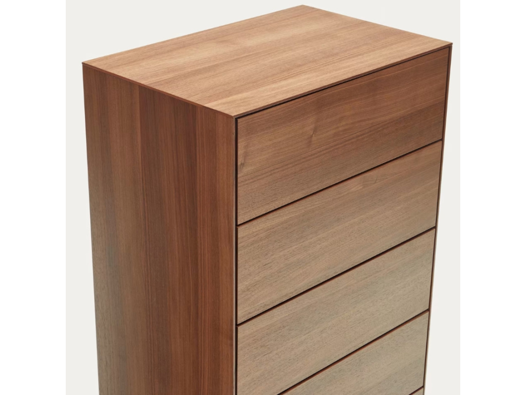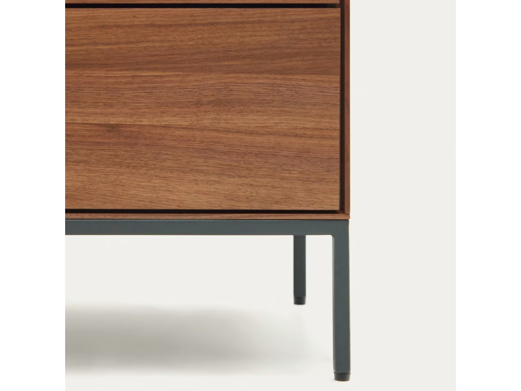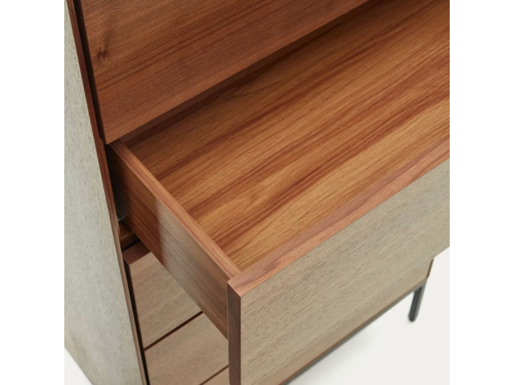 Vysoká komoda Vedrana pochází ze stejnojmenné série nábytku vytvořeného týmem Kave Home. Tyto úložné prostory jsou velice praktické a skvěle se hodí do industriálních i minimalistických interiérů. Spojení ořechové dýhy a vyšší kovové podnože je nejen nadčasové, ale hlavně velice atraktivní. Tato komoda s vyšší podnoží nabízí úložný prostor v podobě pěti prostorných zásuvek. Ty se budou skvěle hodit například ke zorganizování oblečení a spodního prádla Sjednoťte úložné prostory ve vaší domácnosti a vpusťte do ní sérii Vedrana! Vybírat můžete z komod a TV stolků různých velikostí, všechny jsou dostupné v provedení dub i ořech.