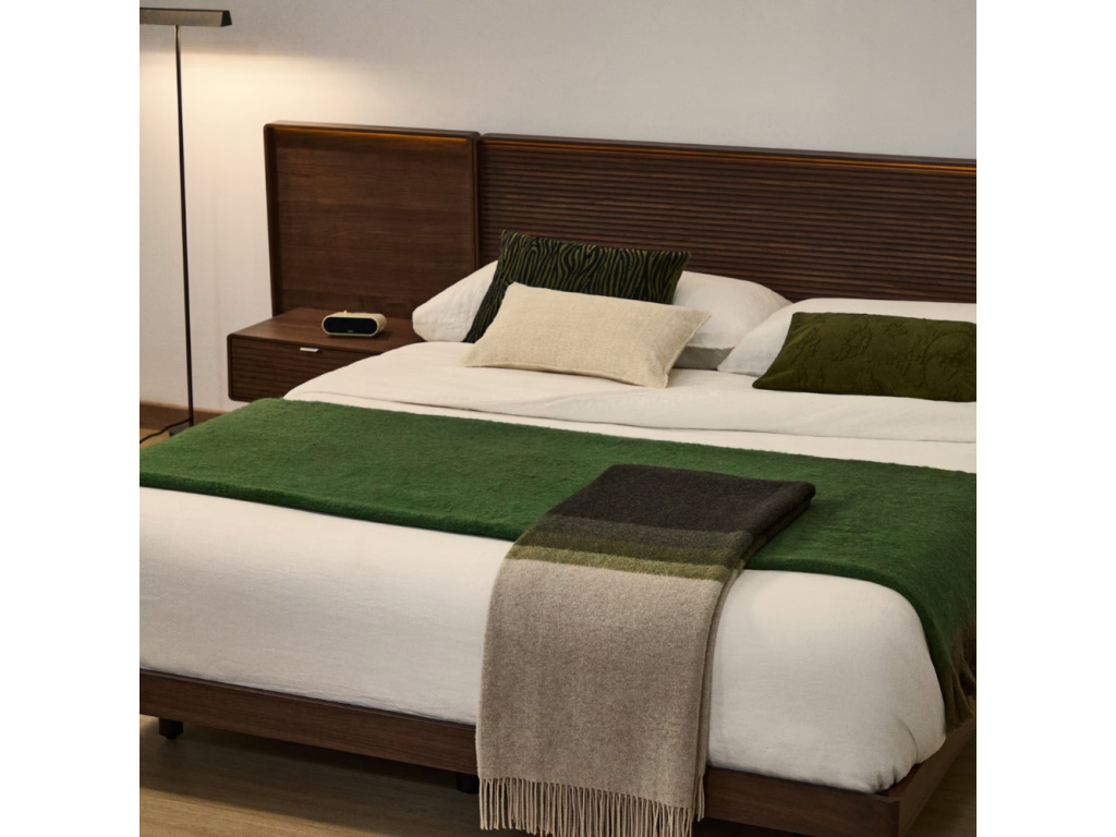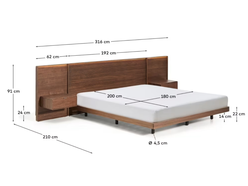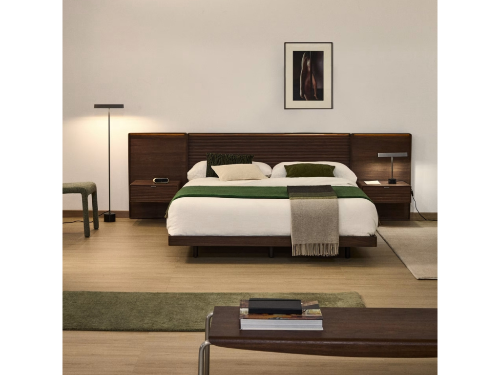 Postel Norlen s integrovanými nočními stolky a LED osvětlením je poctou ikonickému designu 50. let, převedenou do moderního jazyka současných interiérů. Její čelo z ořechové dýhy s jemným horizontálním frézováním přidává prostoru charakter a hloubku, zatímco zabudovaný LED pásek s teplým, příjemným světlem o teplotě 3000 K navozuje útulnou atmosféru ideální pro večerní odpočinek. Světlo se jednoduše ovládá dálkovým ovladačem a doplňuje estetiku celku o praktický detail. Dva dokonale sladěné noční stolky rozšiřují funkčnost postele a nabízí diskrétní úložný prostor se zásuvkami s tichým dovíráním. Díky certifikovanému FSC™ dřevu spojuje Norlen estetiku, komfort i odpovědný přístup k přírodě. Je to kompletní řešení pro ložnici, které propojuje nadčasový design, moderní technologie a příjemnou atmosféru, aby se každý večer stal okamžikem klidu a pohody. Postel můžete navíc doplnit dalším nábytkem ze série Norlen a krásně tak sladit celou ložnici.