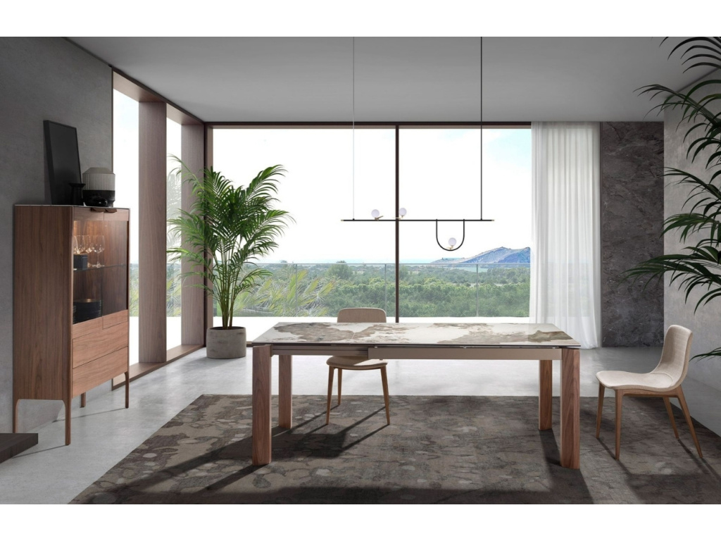 Elegantní vysoká vitrína z ořechové dýhy bude dominantou vašeho obývacího prostoru. Její vnitřní LED osvětlení vytvoří hřejivou atmosféru a dokonale zvýrazní obsah vitríny. Bílá porcelánová deska imitující mramor s jemnými šedými žilkami dodá interiéru luxusní nádech. Praktické úložné prostory v podobě dvou zásuvek s push-to-open mechanismem a polic z tvrzeného skla zajistí nejen estetiku, ale i funkčnost. Nadčasový design vitríny podtrhuje originální podnož z masivního ořechového dřeva.