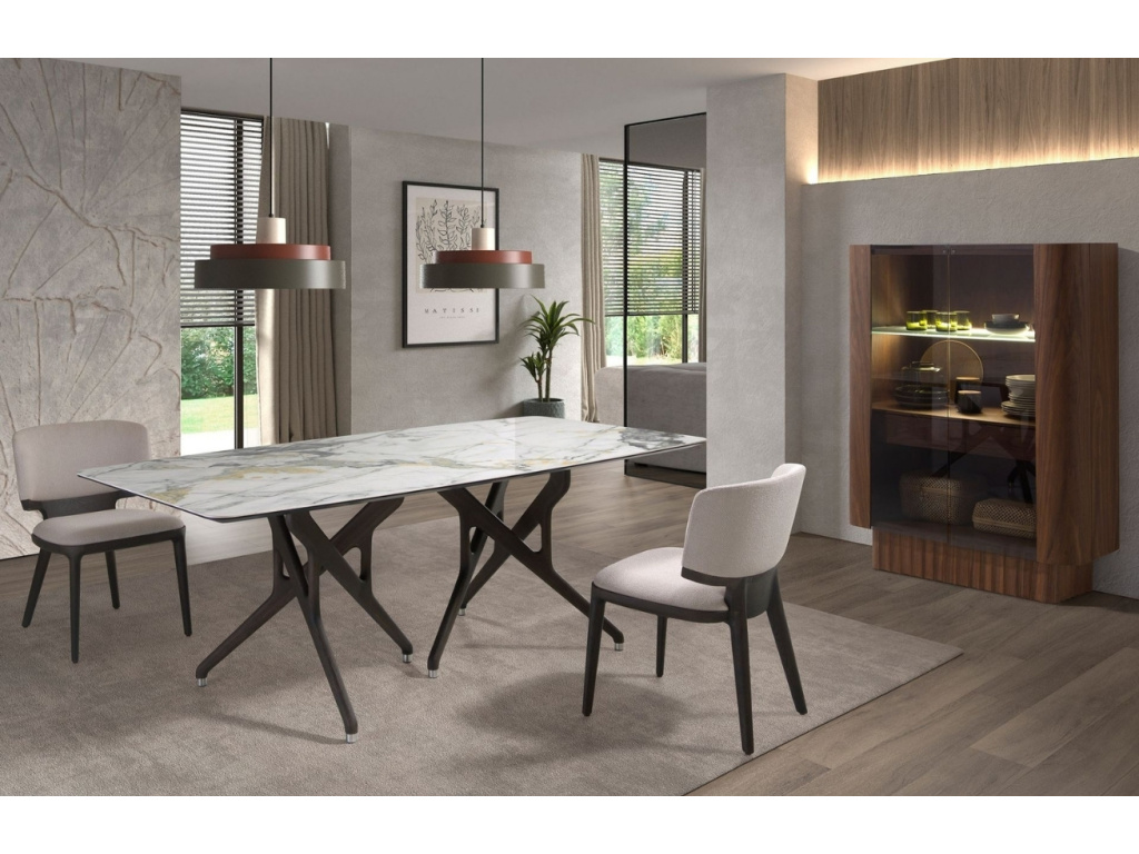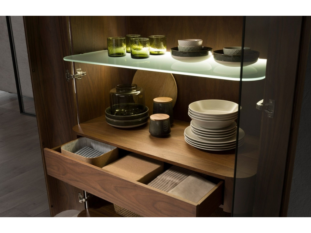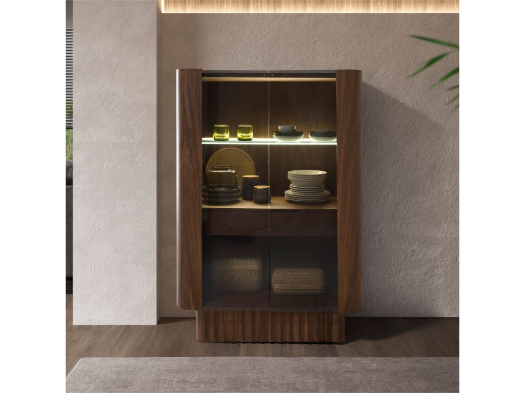 Tato vitrína z ořechové dýhy přinese do vašeho interiéru přírodní krásu a moderní eleganci. Vnitřní LED osvětlení podtrhne exkluzivní design a zvýrazní vystavené předměty. Detaily z tvrzeného skla dodají vitríně vzdušnost a lehkost. Praktické úložné prostory s tichým dovíráním dvířek a zásuvky zajistí maximální praktičnost při každodenním používání. Robustní podnož z masivního dřeva zajišťuje nejen stabilitu, ale i jedinečný designový prvek.