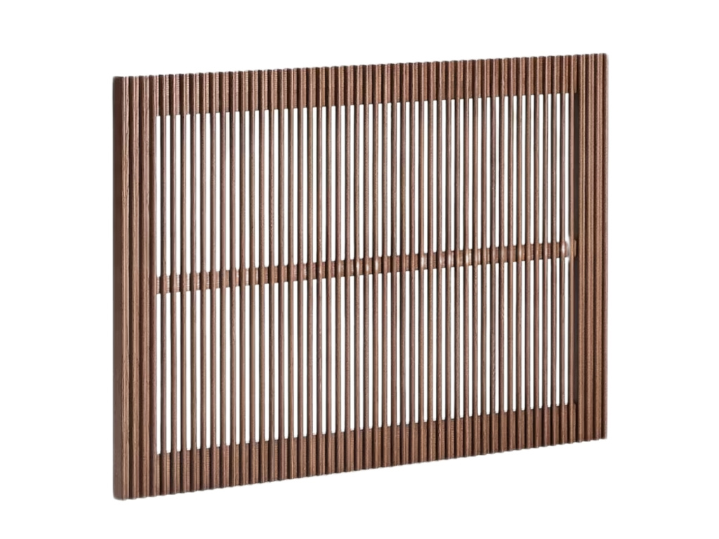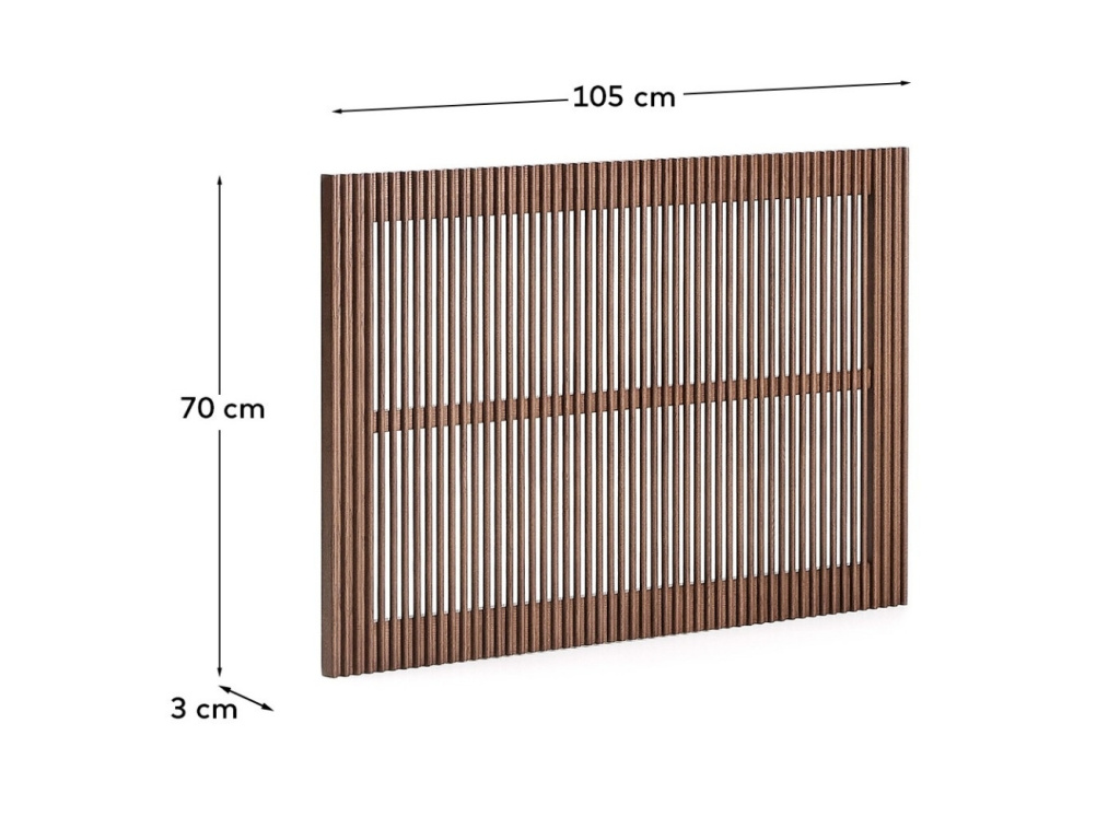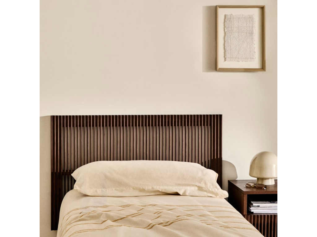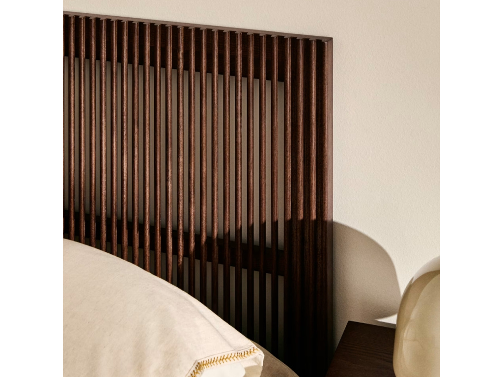 Čelo k posteli Beyla je vyrobena z jasanového dřeva v elegantním a hřejivém ořechovém odstínu. Zaujme svým poloprůhledným provedením – je totiž tvořeno vertikálními lamelami. Pokud zrovna přemýšlíte, jak dát vaší posteli nový kabát, aby zase získala šmrnc, může být toto čelo skvělým řešením. Navíc je součástí kolekce, ve které najdete i noční stolek, TV stolek, knihovnu nebo komodu dvou velikostí, což vám umožní vytvořit harmonický a nadčasový interiér v jednotném stylu. Všechen použitý materiál pochází zcertifikovaného FSC™ dřeva, což potvrzuje šetrný přístup k přírodě. Výsledkem je funkční i dekorativní kus nábytku, který vnáší do prostoru útulnou atmosféru, eleganci a dlouhověkost. Čelo je vhodné k matracím o šířce 90 cm a k dostání je také ve dvou dalších velikostech.