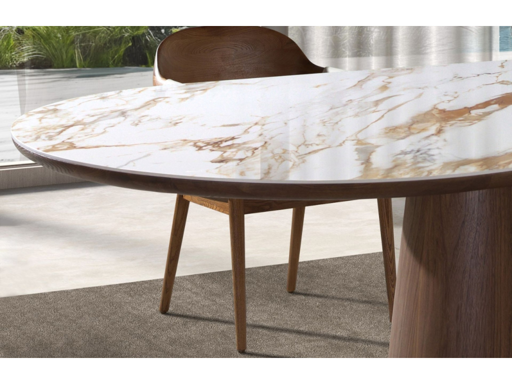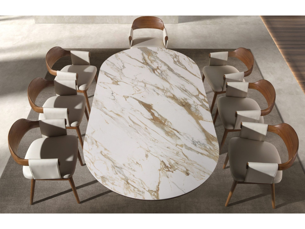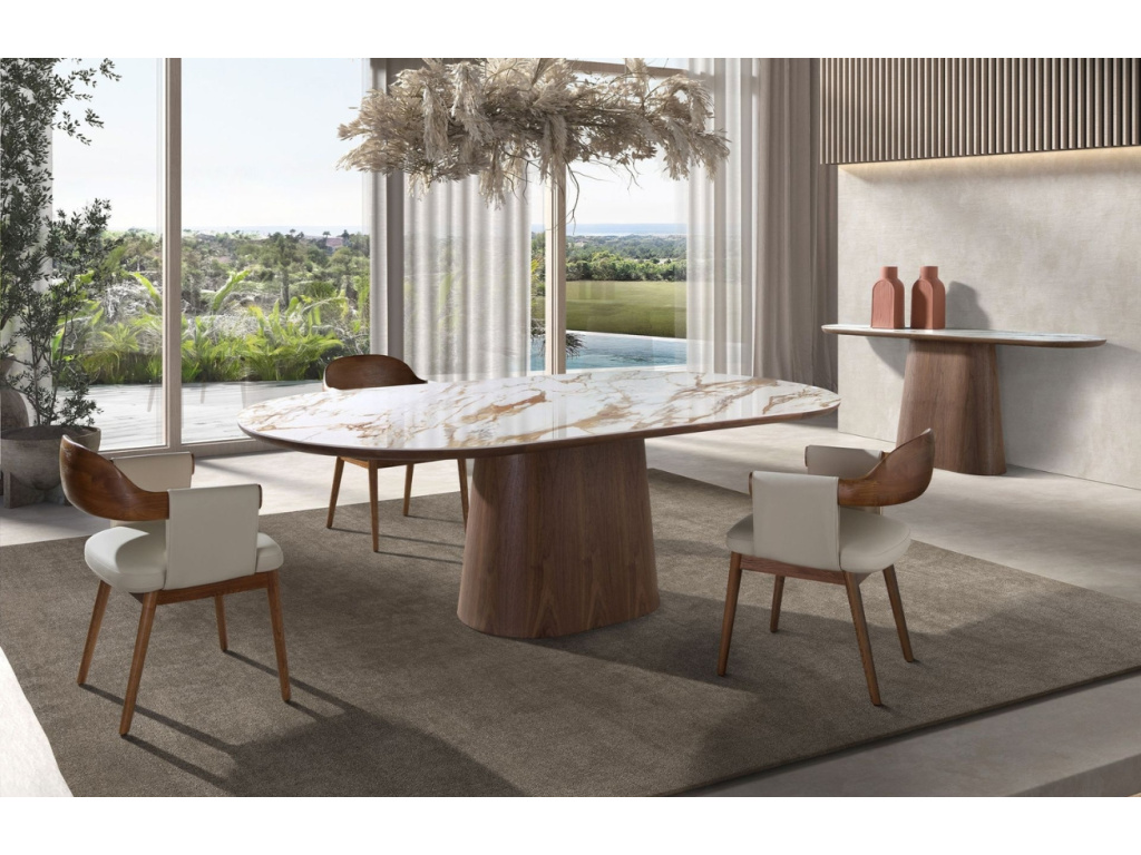 Objevte krásu kontrastů s jídelním stolkem Angel Cerdá – oválným kouskem, který v sobě spojuje přirozené teplo ořechové dýhy a luxusní vzhled porcelánové desky v mramorovém dekoru. Porcelánová horní deska je odolná vůči poškrábání i vysokým teplotám, a díky tomu je nejen krásná, ale i funkční. Podnož s ořechovou povrchovou úpravou působí subtilně, přesto poskytuje stabilní základ. Tento stůl se stane středobodem celé domácnosti, u kterého budete s radostí trávit čas s rodinou i hostit vaše návštěvy. Sladit ho navíc můžete také s odkládacím, konferenčním a toaletním stolkem!